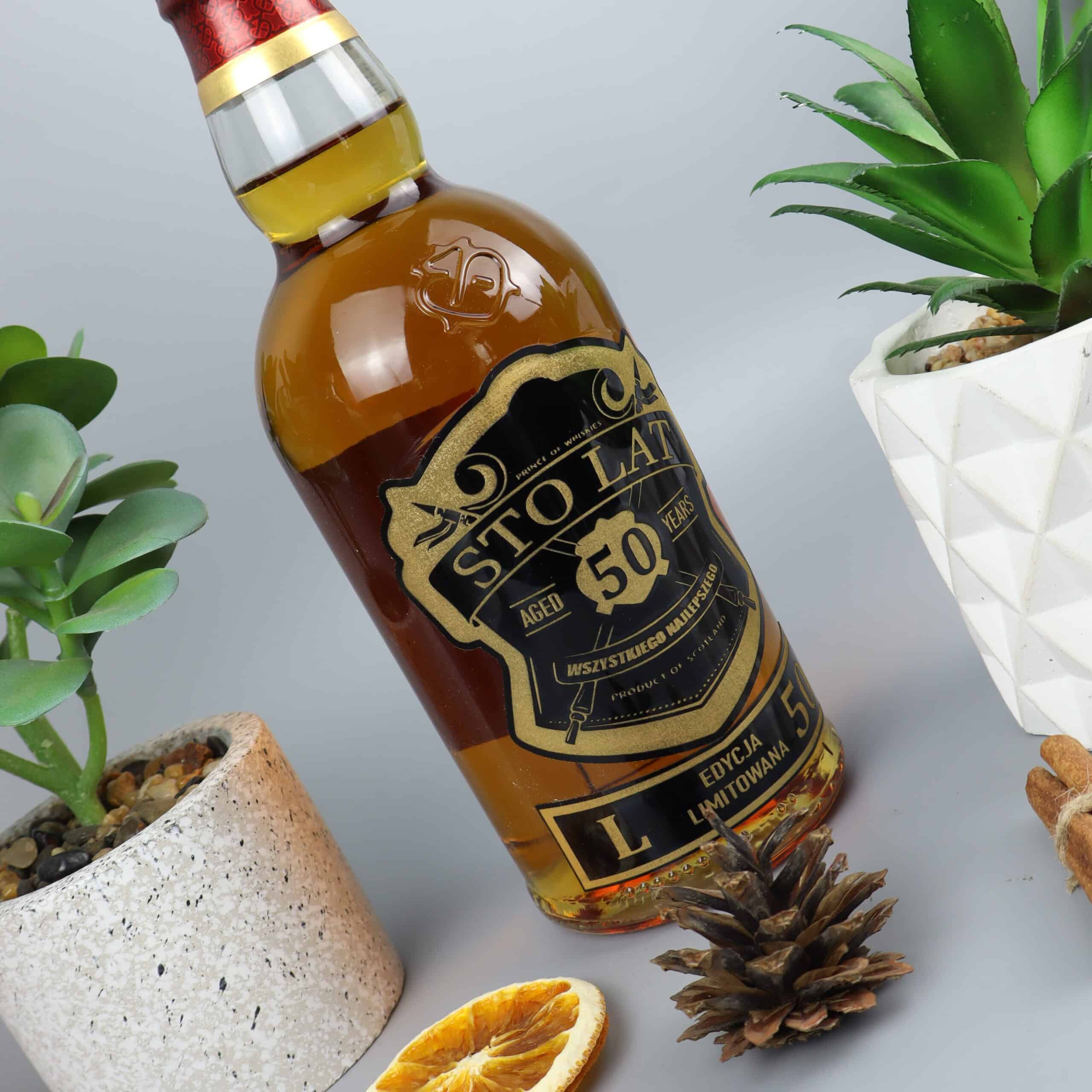 • Limitowana etykieta „STO LAT” – ozdobna, czarno-złota etykieta z rocznicowym motywem i hasłem „Wszystkiego najlepszego – years” podkreśla wyjątkowy charakter prezentu.