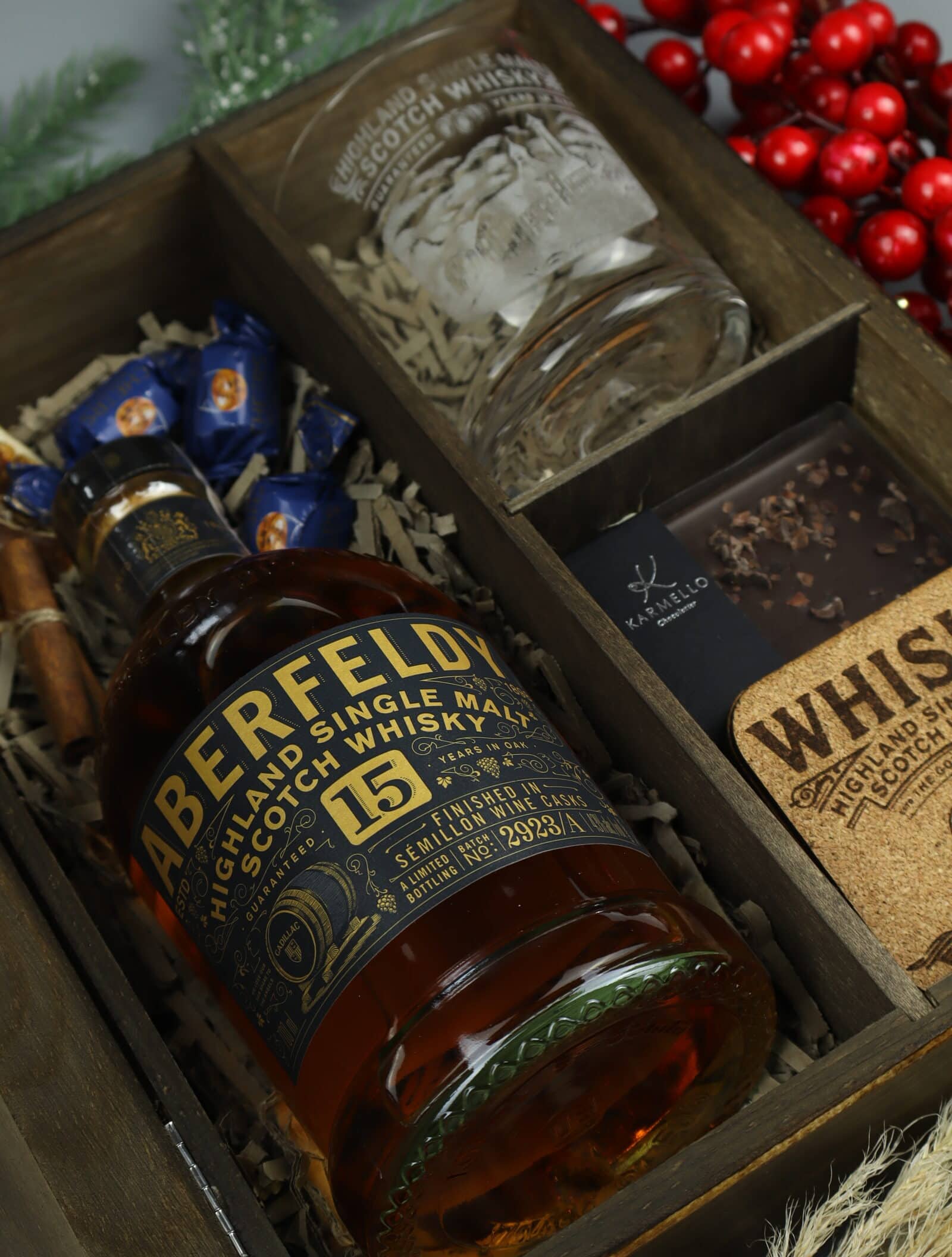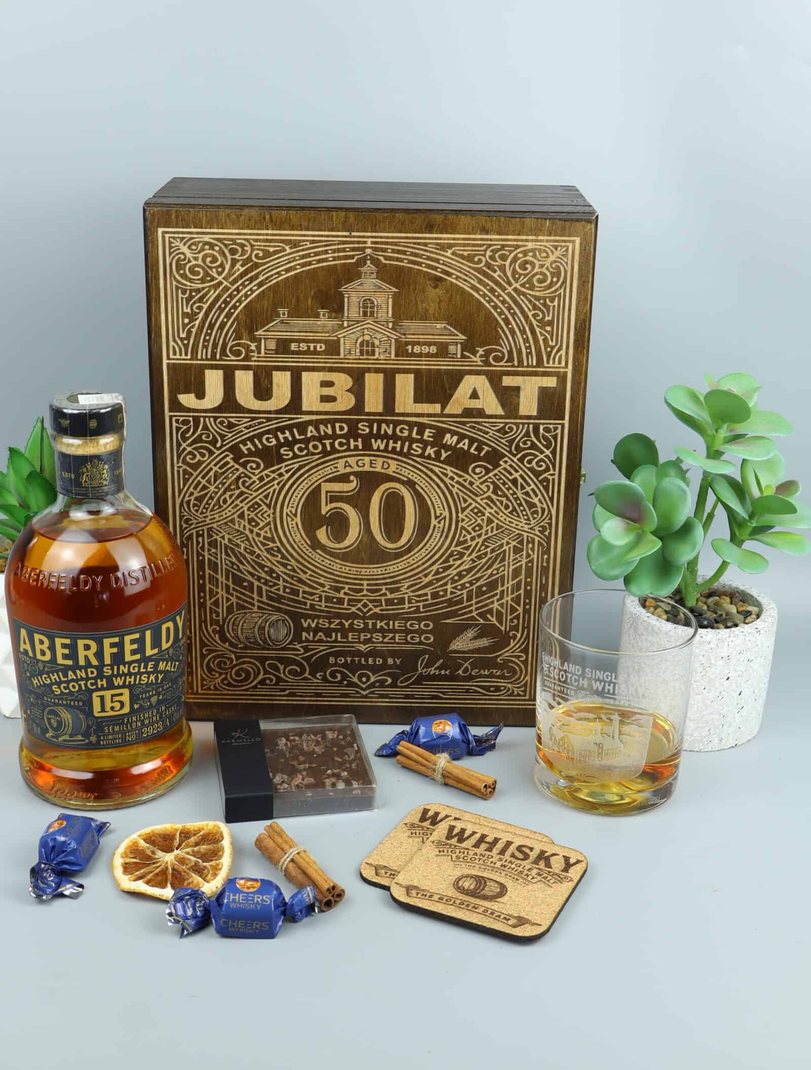 Chcesz podarować prezent, który na długo zapadnie w pamięć? Nasz zestaw z Aberfeldy 15YO Highland Single Malt Scotch Whisky to propozycja pełna klasy i charakteru, idealna na wyjątkowe urodziny. Szlachetna whisky, grawerowana drewniana skrzynia i komplet dodatków sprawiają, że całość staje się luksusowym upominkiem, gotowym do wręczenia.