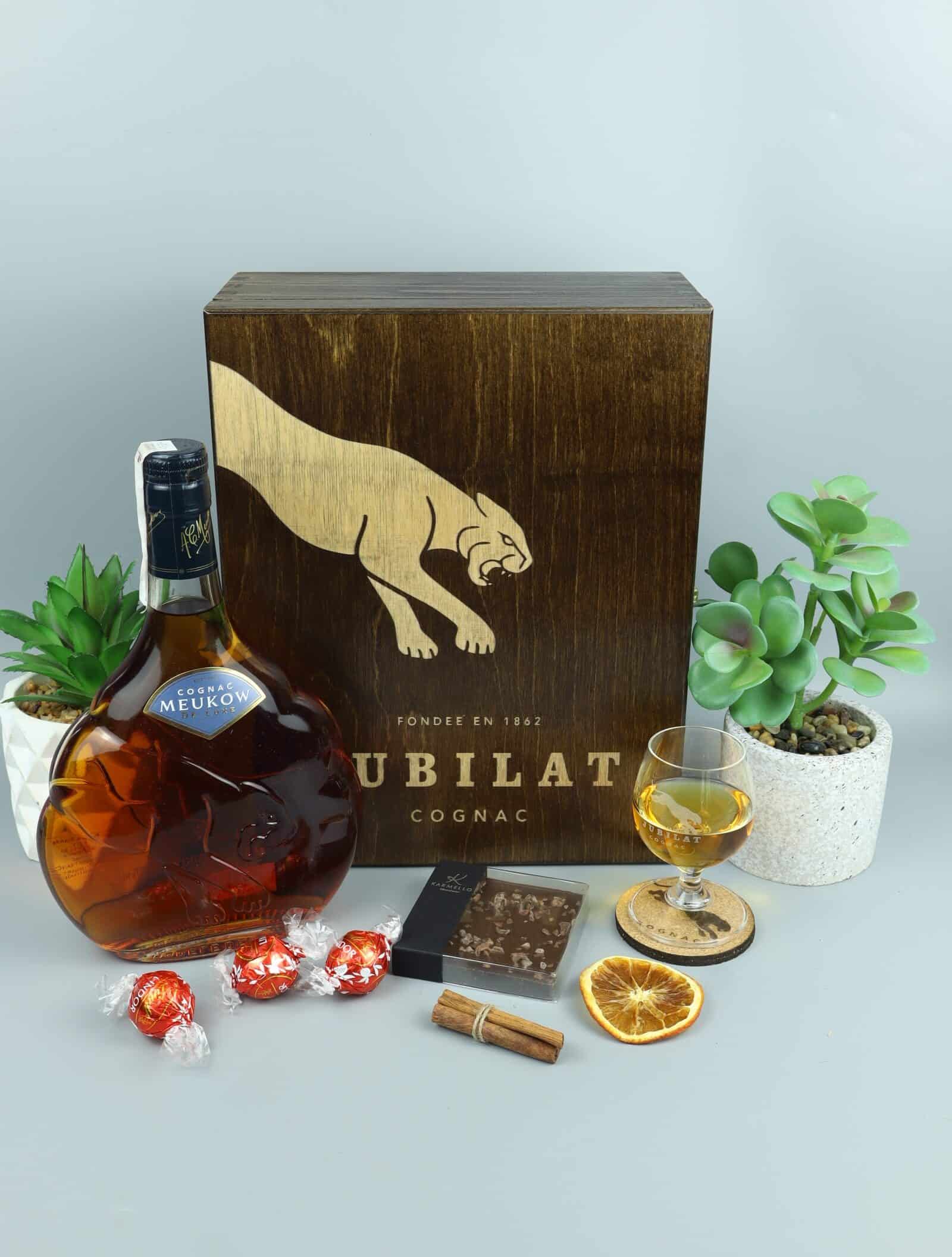 Ten luksusowy zestaw prezentowy to idealny upominek na wyjątkowe okazje. W eleganckim, grawerowanym drewnianym pudełku, z motywem pantery, znajduje się butelka koniaku Meukow.