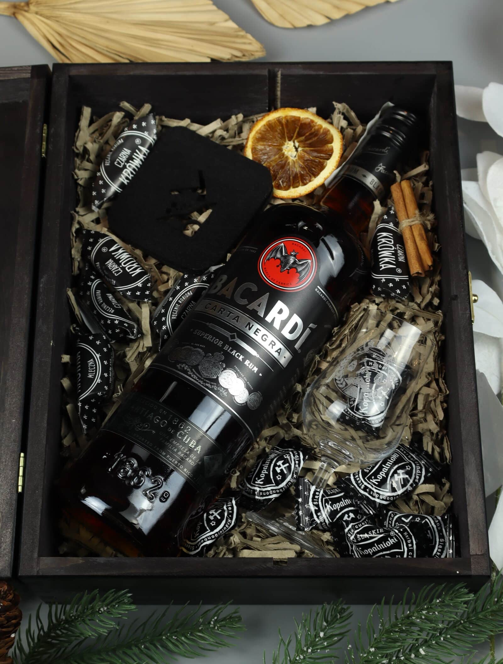 Prestiżowy zestaw na Barbórkę z rumem Bacardi Carta Negra. Luksusowa, czarna skrzynka z górniczym, złotym grawerem (kilofy, lampy), kieliszek degustacyjny z grawerem oraz śląskie słodycze 'Krówka’ i 'Kopalniok’ tworzą elegancki i tematyczny upominek dla Górnika lub Szefa.