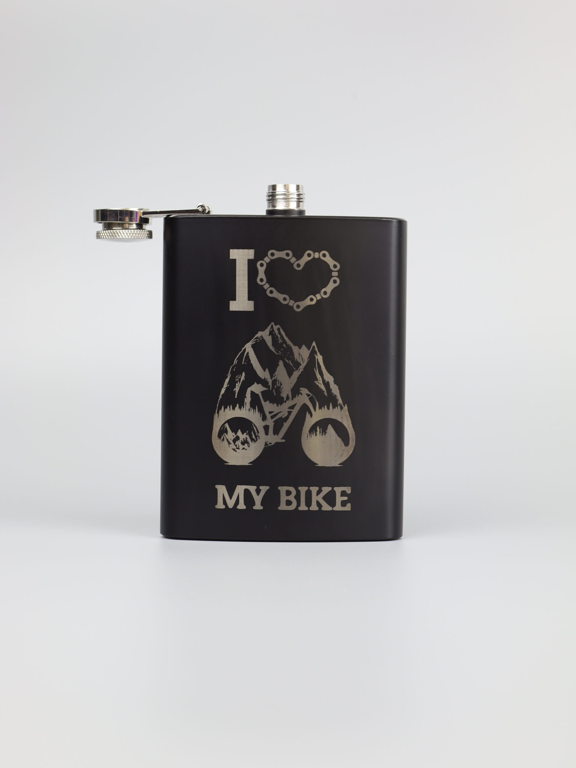 • Piersiówka „I Love My Bike”:  Stalowa piersiówka o pojemności 210 ml, zdobiona wyjątkowym grawerem przedstawiającym rower w górach.