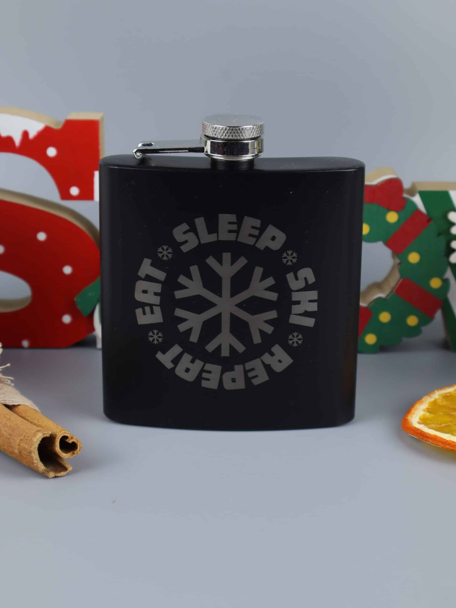 Czarna Piersiówka z Grawerem „Eat Sleep Ski Repeat” – Idealny Prezent dla Narciarza