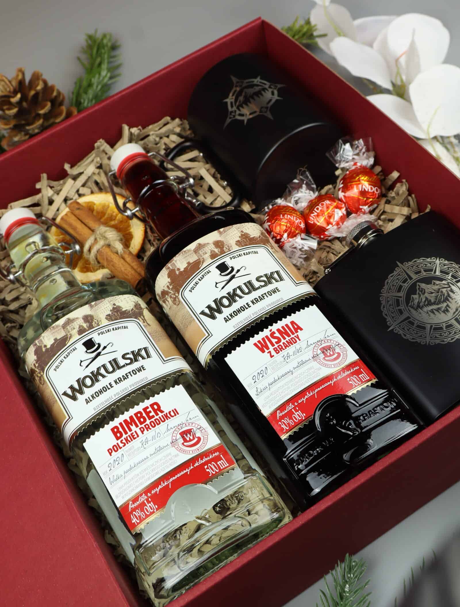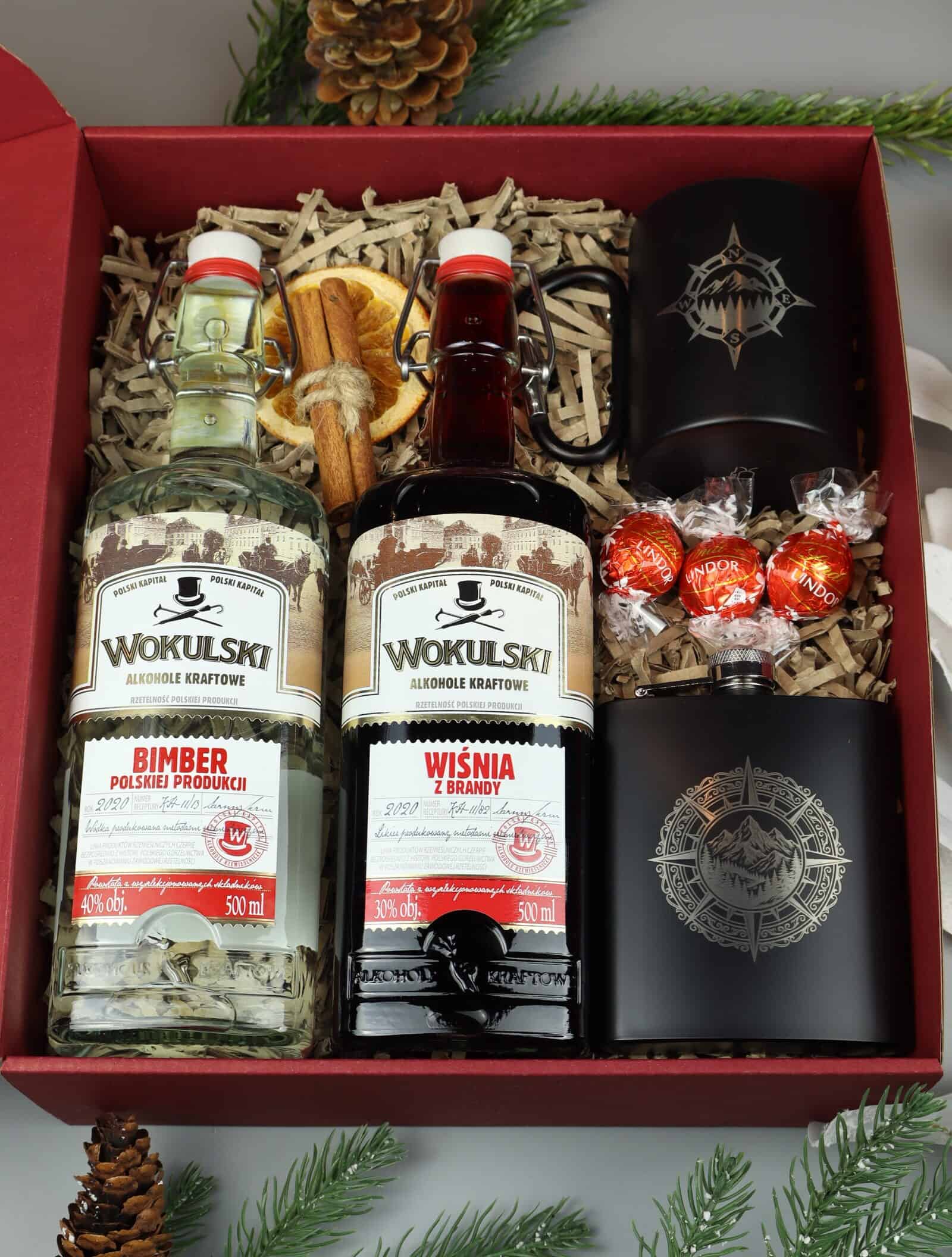 - Duet kraftowych trunków: W zestawie znajdziesz aż dwie butelki Wokulski – tradycyjny Bimber oraz wykwintną Wiśnię z Brandy w stylu retro.
