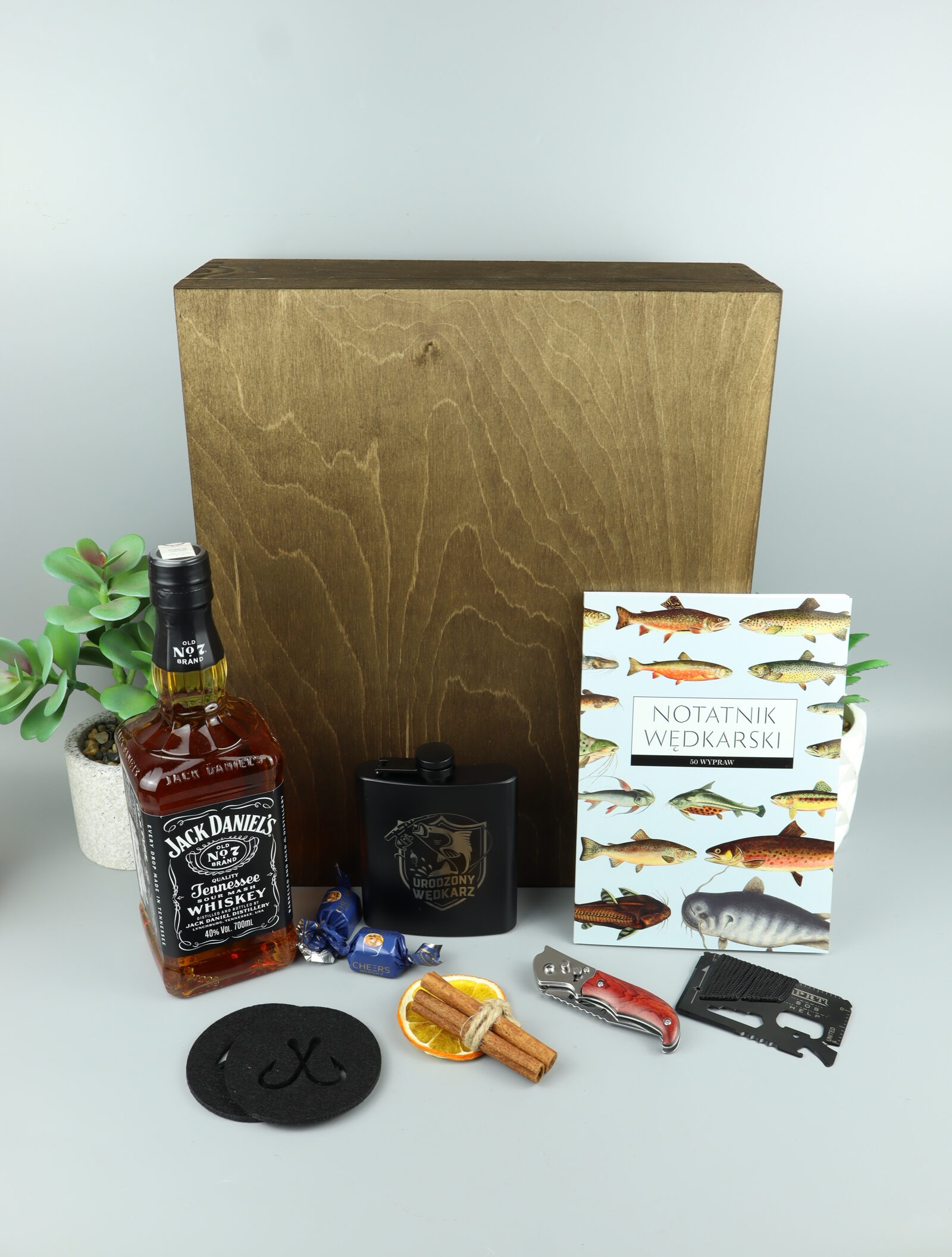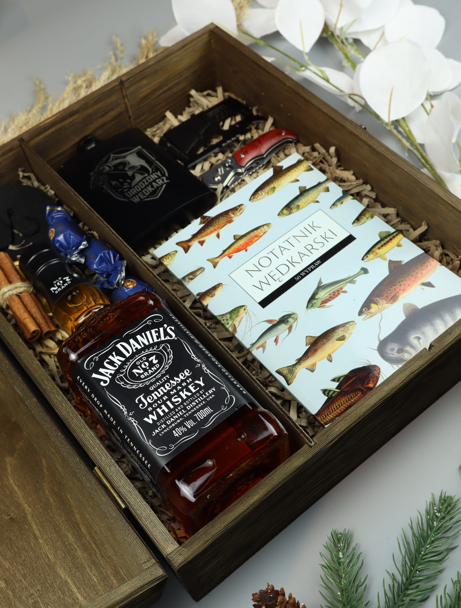 Nasz zestaw prezentowy dla wędkarza z whisky Jack Daniel’s to idealna propozycja dla osób, które kochają spędzać czas nad wodą. Połączenie klasycznej amerykańskiej whisky Jack Daniel’s, praktycznych akcesoriów wędkarskich oraz eleganckiej piersiówki z grawerem tworzy wyjątkowy zestaw dla pasjonata wędkarstwa. Całość zapakowana jest w solidną drewnianą skrzynkę, która podkreśla charakter prezentu i sprawia, że zestaw doskonale nadaje się na urodziny, jubileusz lub jako oryginalny upominek dla wędkarza.