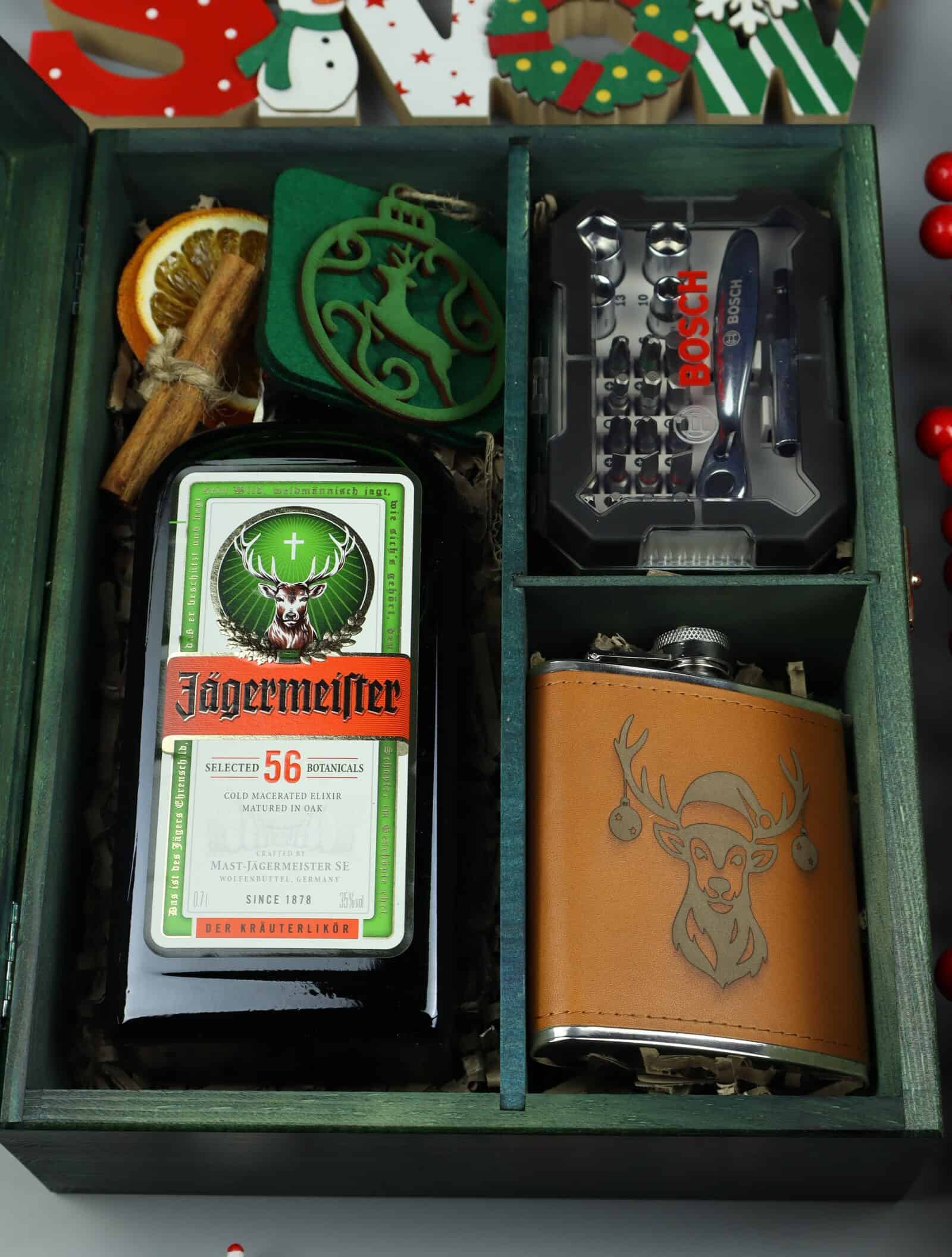 Zestaw Jägermeister Świąteczny to idealny upominek łączący smak, funkcjonalność i elegancję. Oryginalny Jägermeister, piersiówka z grawerem, podkładki z filcu, bombka ze sklejki oraz zestaw narzędzi Bosch lub DeWalt (do wyboru) zamknięte w drewnianej skrzynce z grawerem tworzą prezent, który zachwyci każdego fana praktycznych i stylowych upominków.