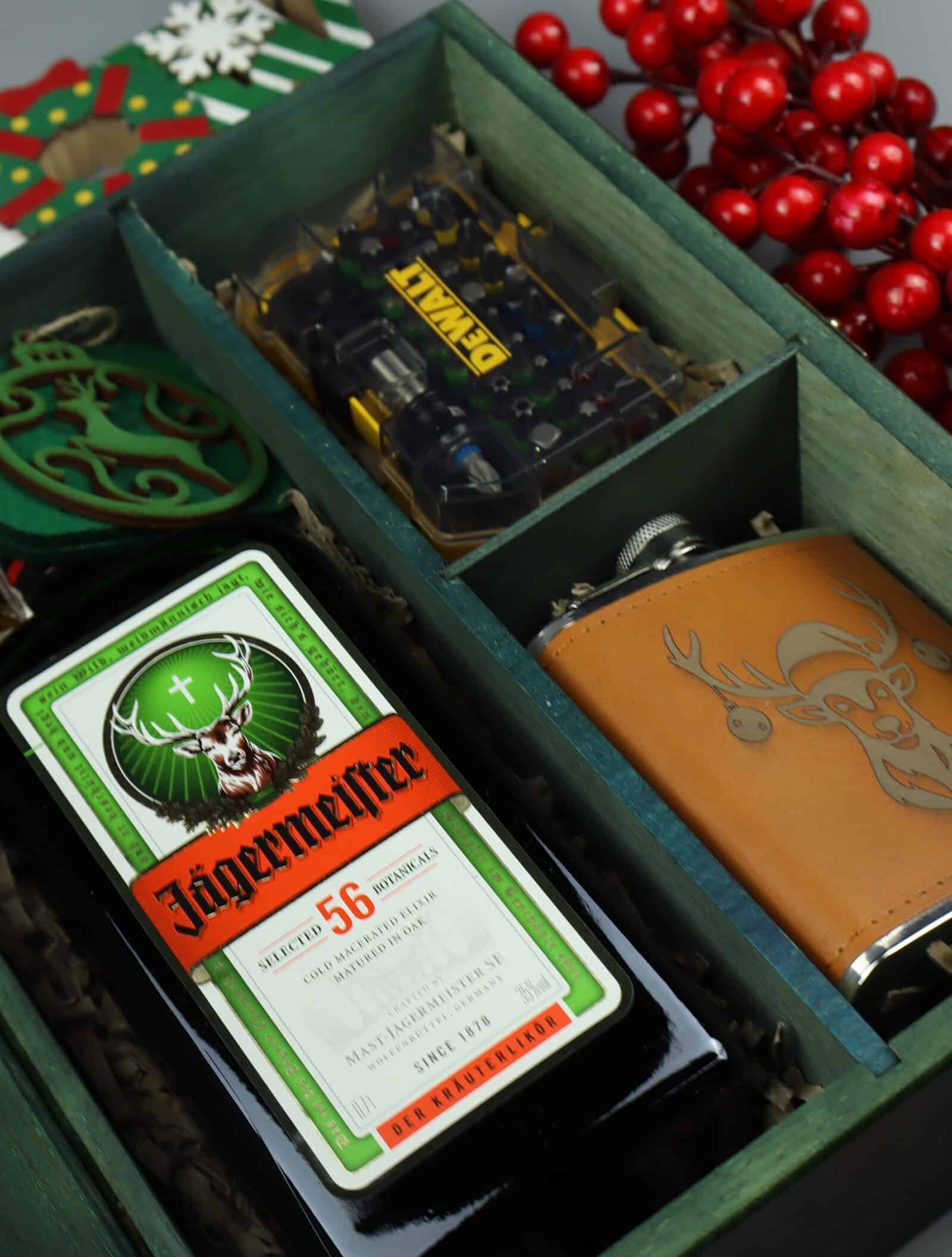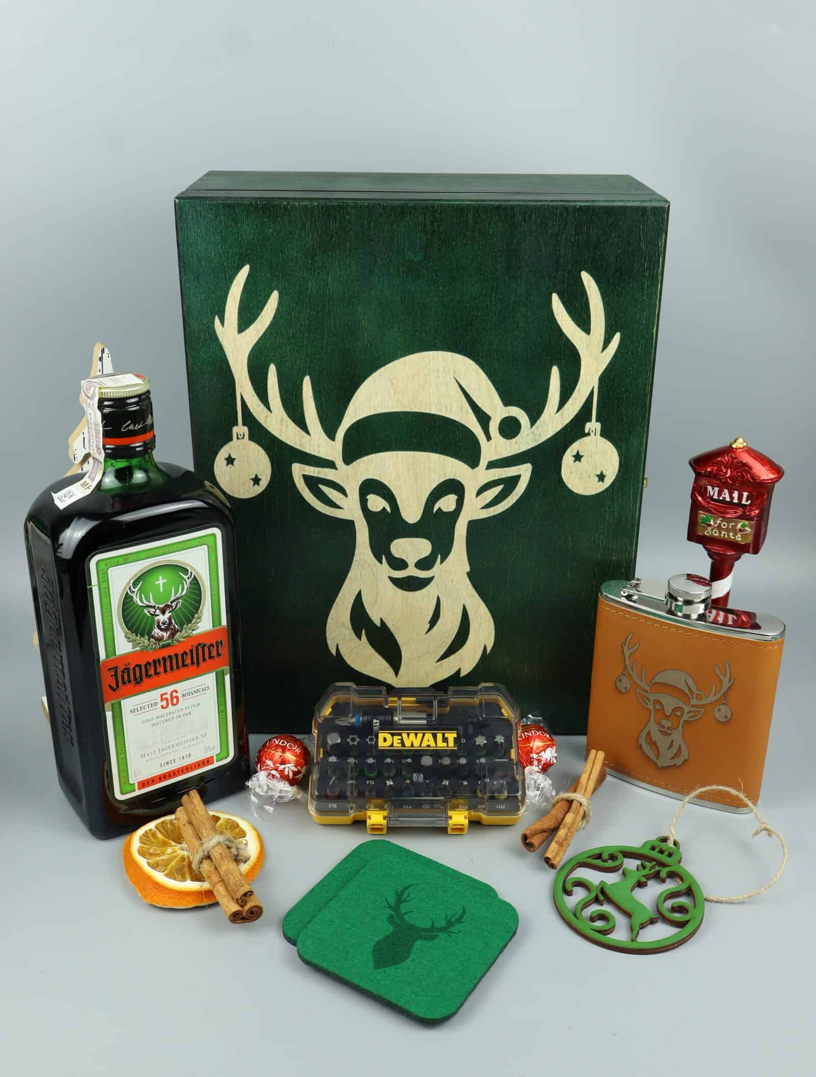Luksusowy, świąteczny zestaw Jägermeister w zielonej skrzynce. Butelka kultowego likieru, tematyczna piersiówka, akcesoria z reniferem Mikołaja oraz poręczny zestaw bitów Bosch lub DeWalt. Idealny prezent dla majsterkowicza na zimę.
