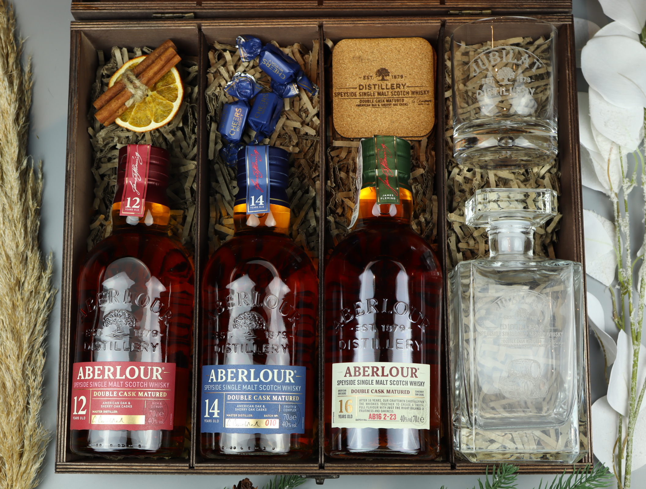 - Kompletna podróż smakowa: Aż trzy butelki wybitnej whisky Aberlour (12, 14, 16 lat), idealne do przeprowadzenia pionowej, prywatnej degustacji.