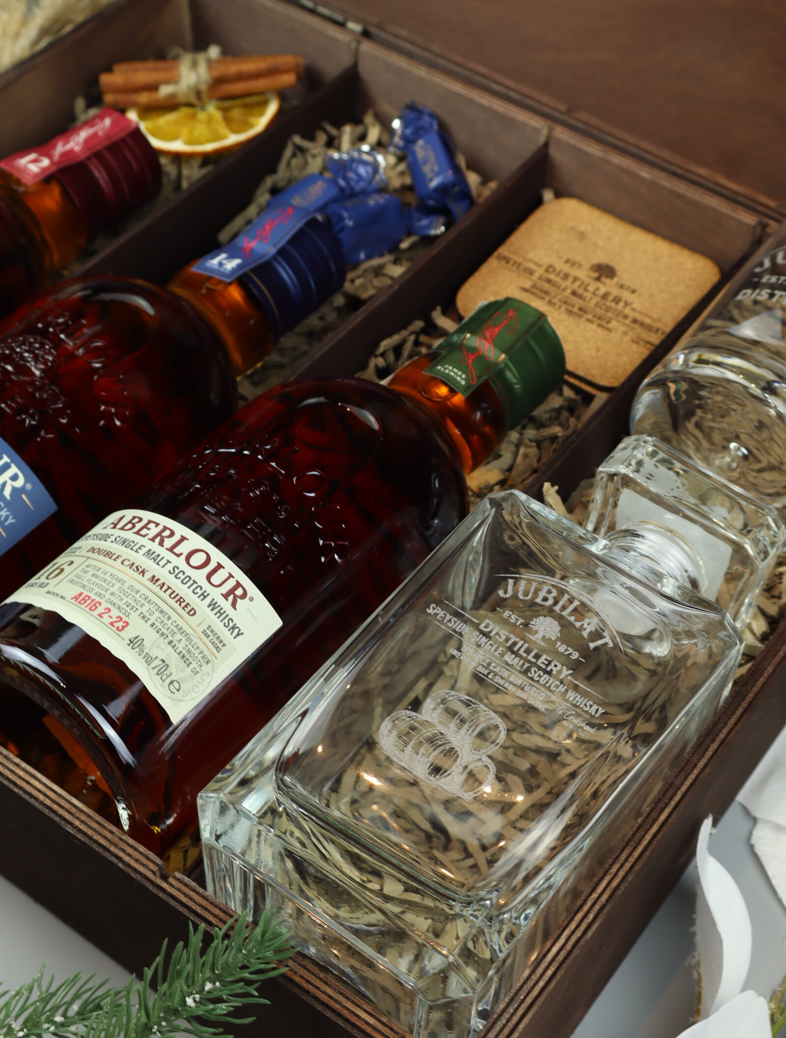 Całość została zapakowana w stylową drewnianą skrzynkę, która w połączeniu z elegancką karafką oraz szklanką do whisky z grawerem tworzy luksusowy zestaw degustacyjny. To doskonały prezent dla konesera whisky lub wyjątkowy upominek biznesowy.