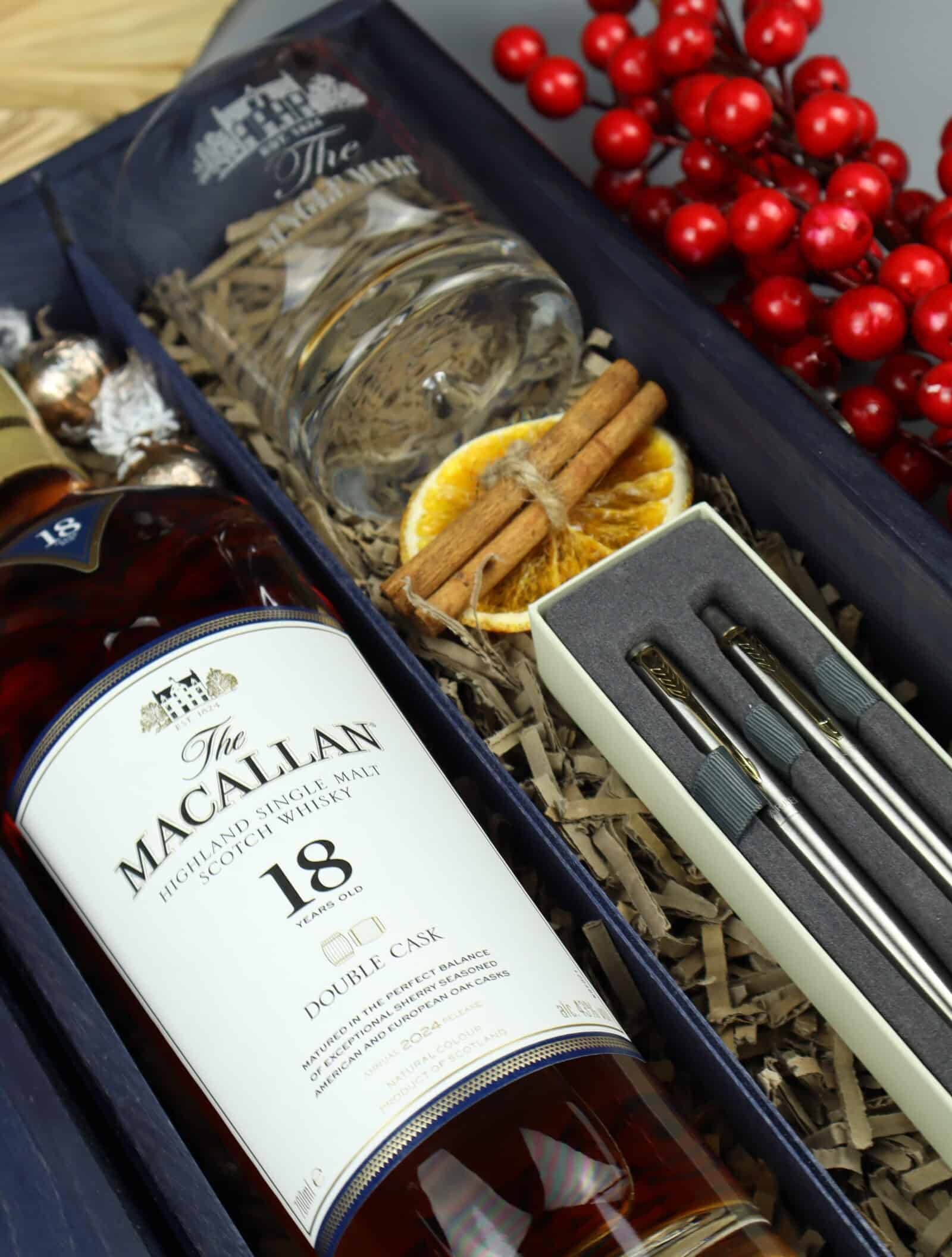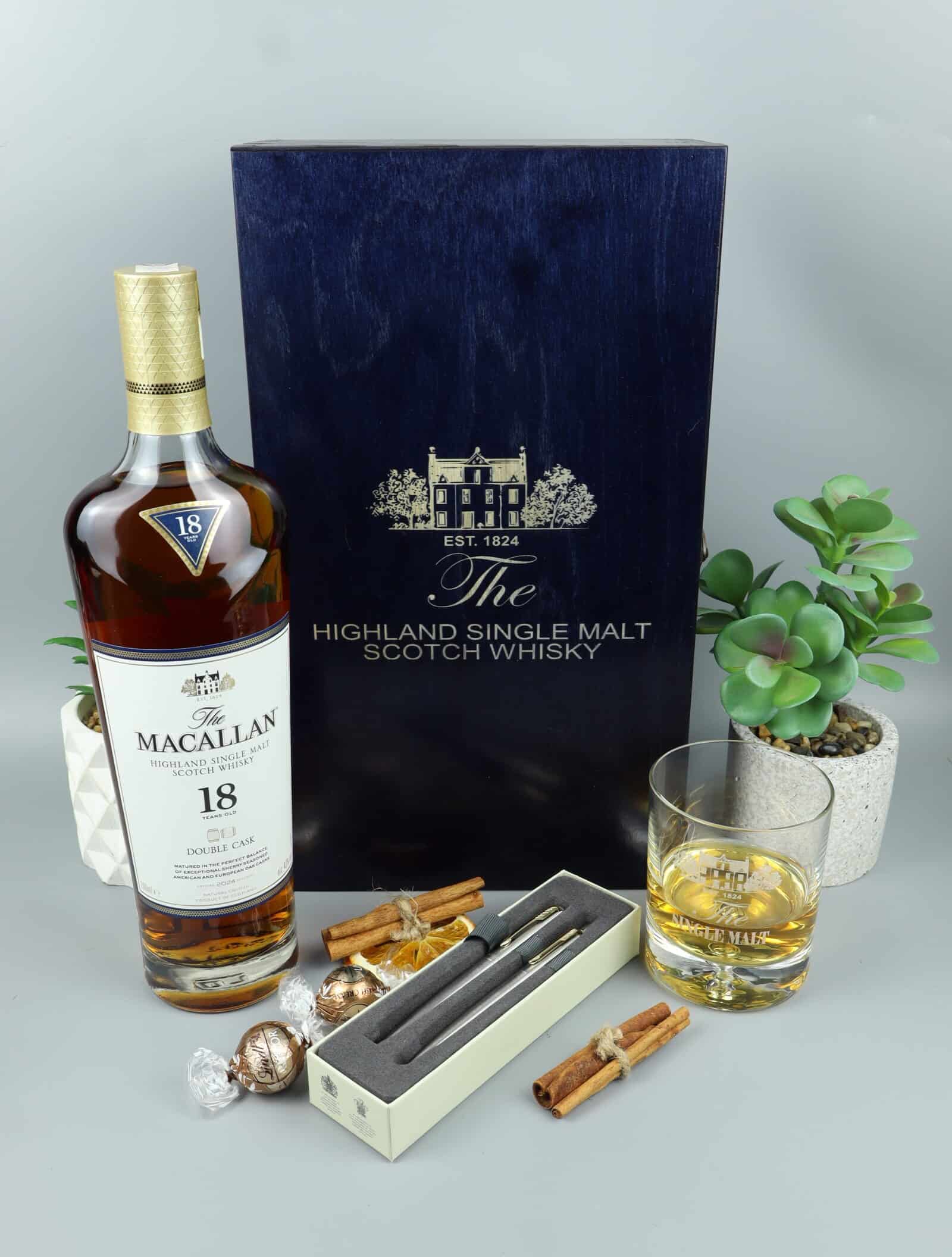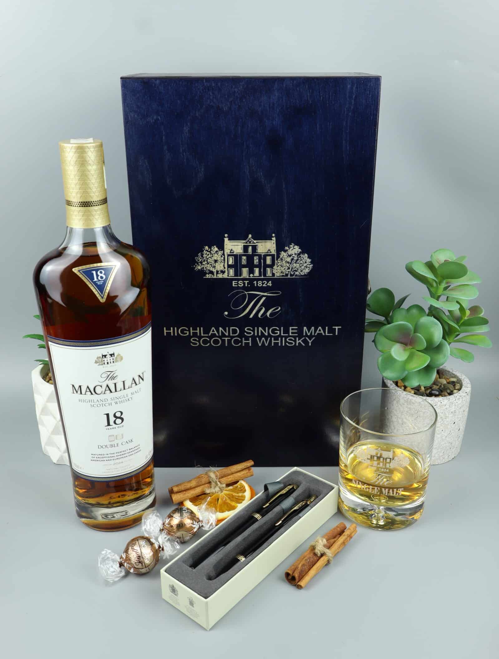 Ultra luksusowy zestaw z whisky The Macallan 18 Year Old Double Cask. Elegancka, granatowa skrzynka premium, butelka prestiżowej whisky, ekskluzywny zestaw piśmienniczy i szklanka tworzą idealny upominek dla konesera.