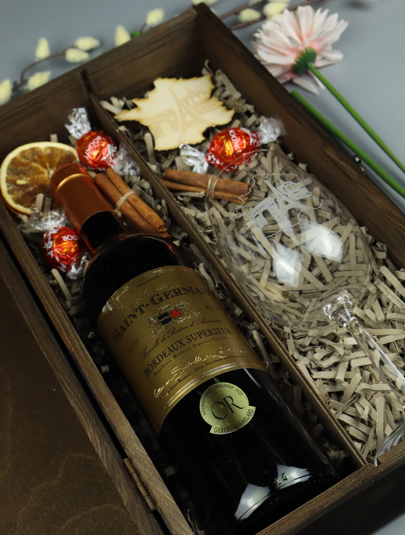 - Wino Klasy Premium: Zawiera wino Bordeaux Supérieur – francuski klasyk, co podnosi prestiż i autentyczność zestawu.