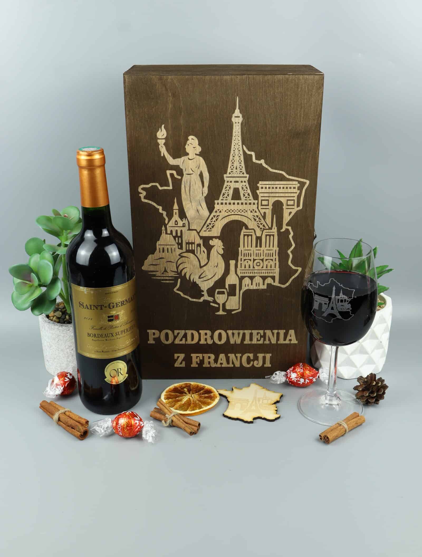 - Drewniane skrzynka „Pozdrowienia z Francji” – zdobione laserowo symbolami Francji: Wieża Eiffla, Łuk Triumfalny, katedra Notre-Dame i kogut