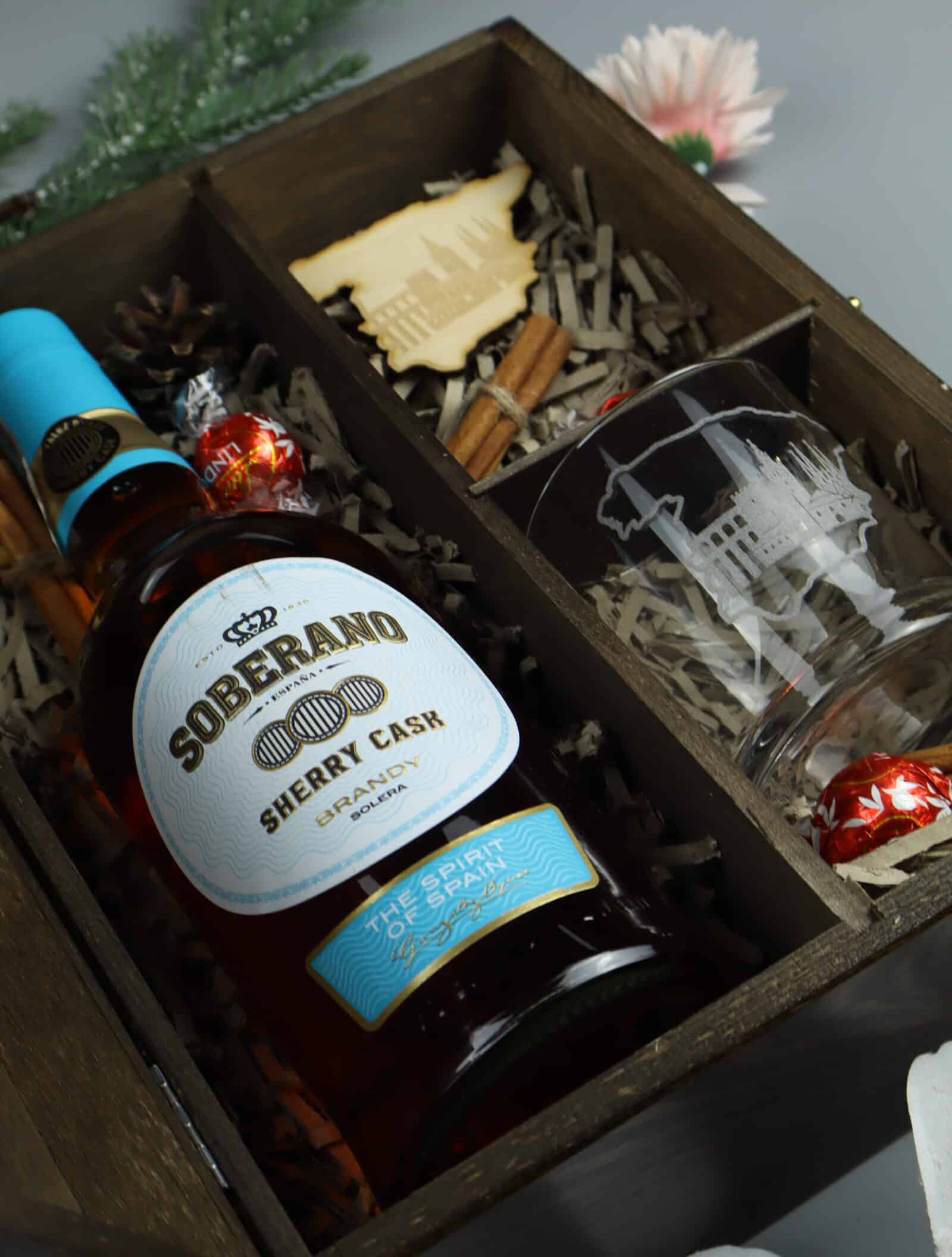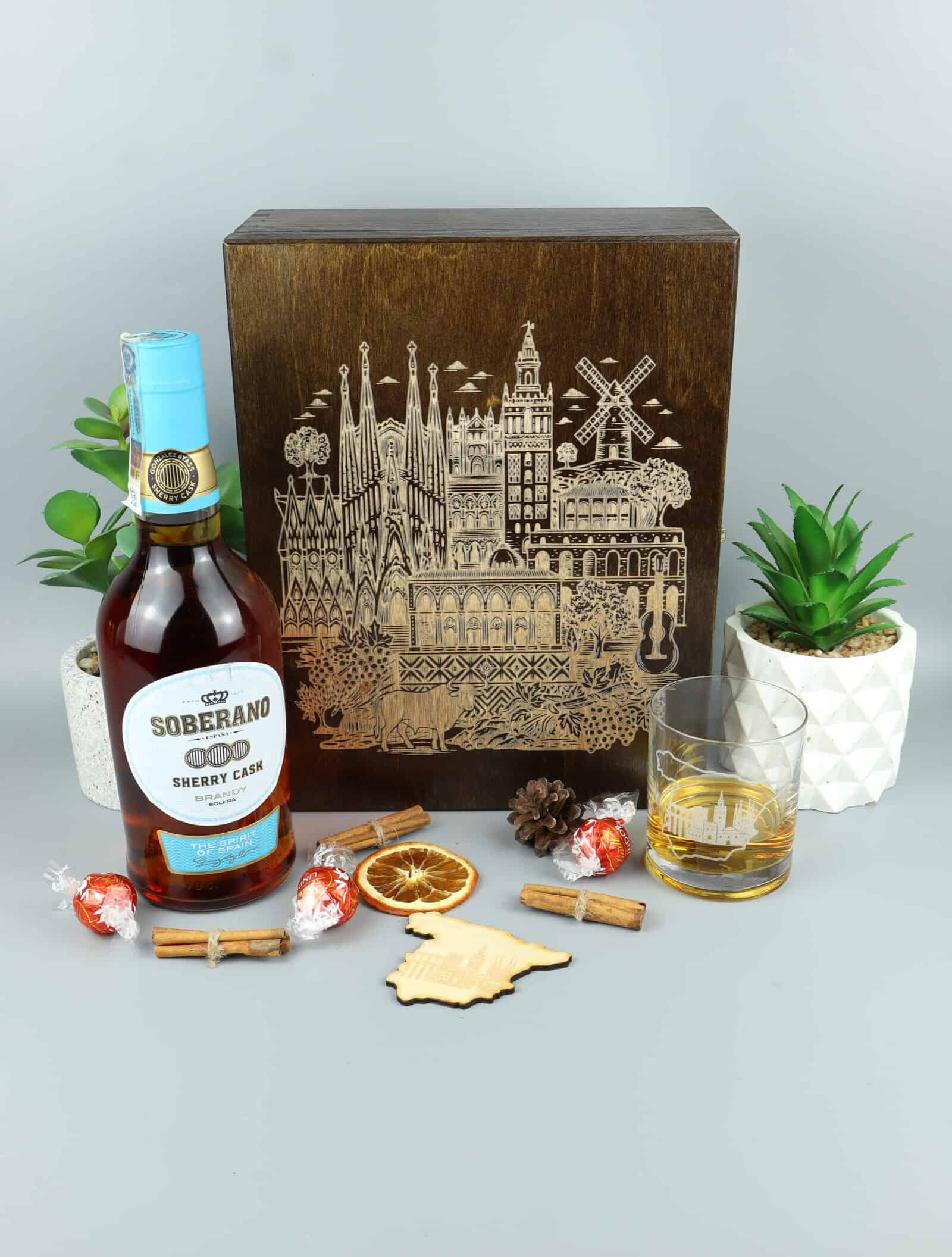 Wyjątkowy zestaw Soberano „Pozdrowienia z Hiszpanii” to idealny prezent dla miłośników hiszpańskich smaków i klimatu południowej Europy. W zestawie znajduje się aromatyczna brandy dojrzewająca w beczkach po sherry, elegancka szklanka z grawerem oraz magnes w kształcie mapy Hiszpanii – całość zamknięta w stylowym, drewnianym pudełku z grawerowanymi motywami hiszpańskiej architektury.