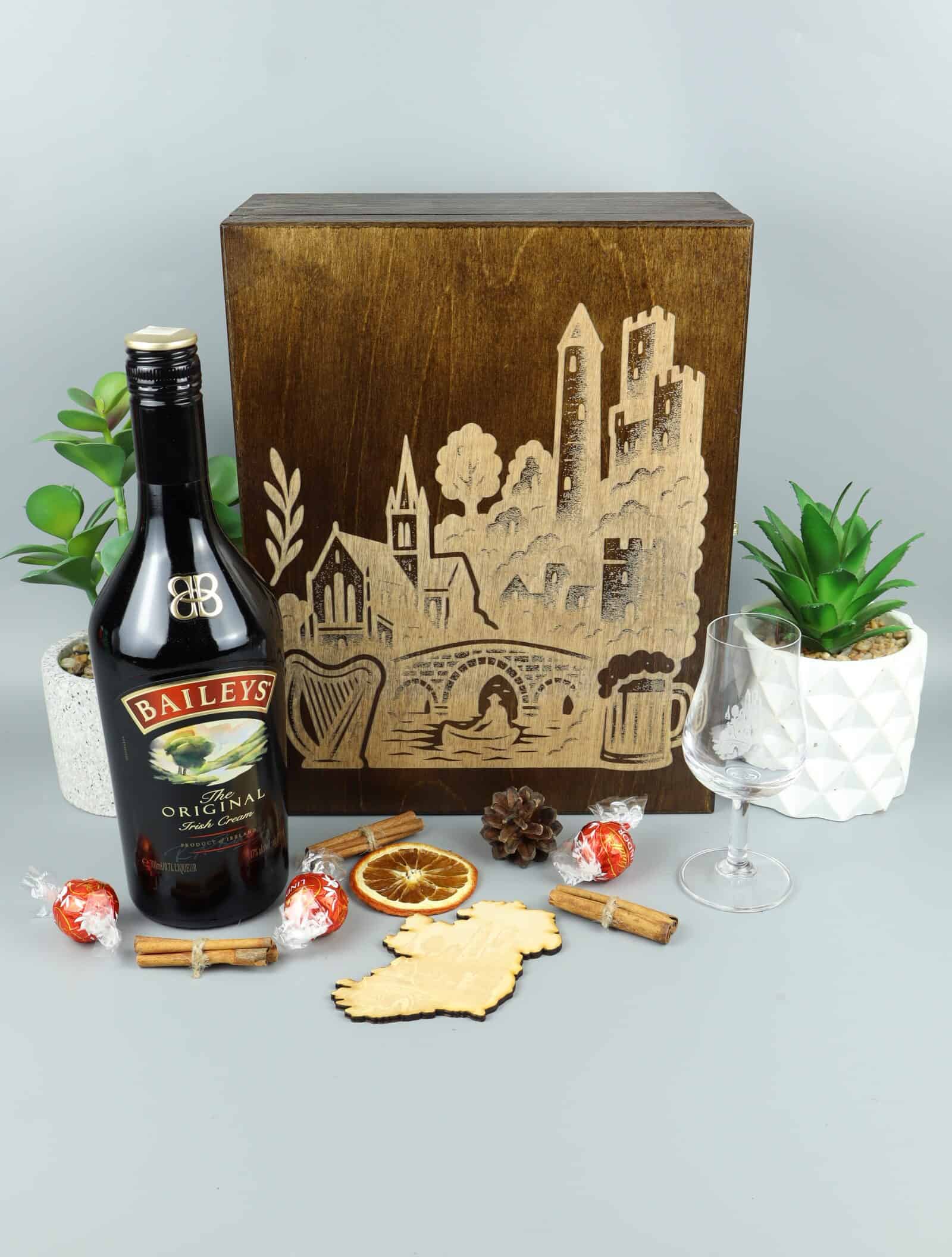 - Drewniana skrzynka z grawerem „Pozdrowienia z Irlandii” – ozdobione laserowo z motywem zamków, mostów i charakterystycznych irlandzkich symboli