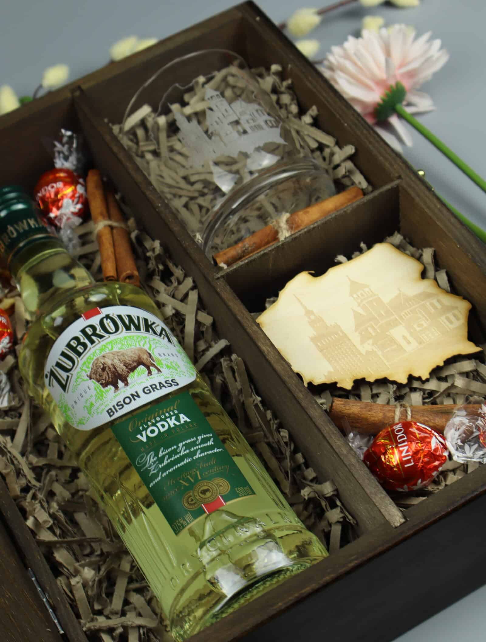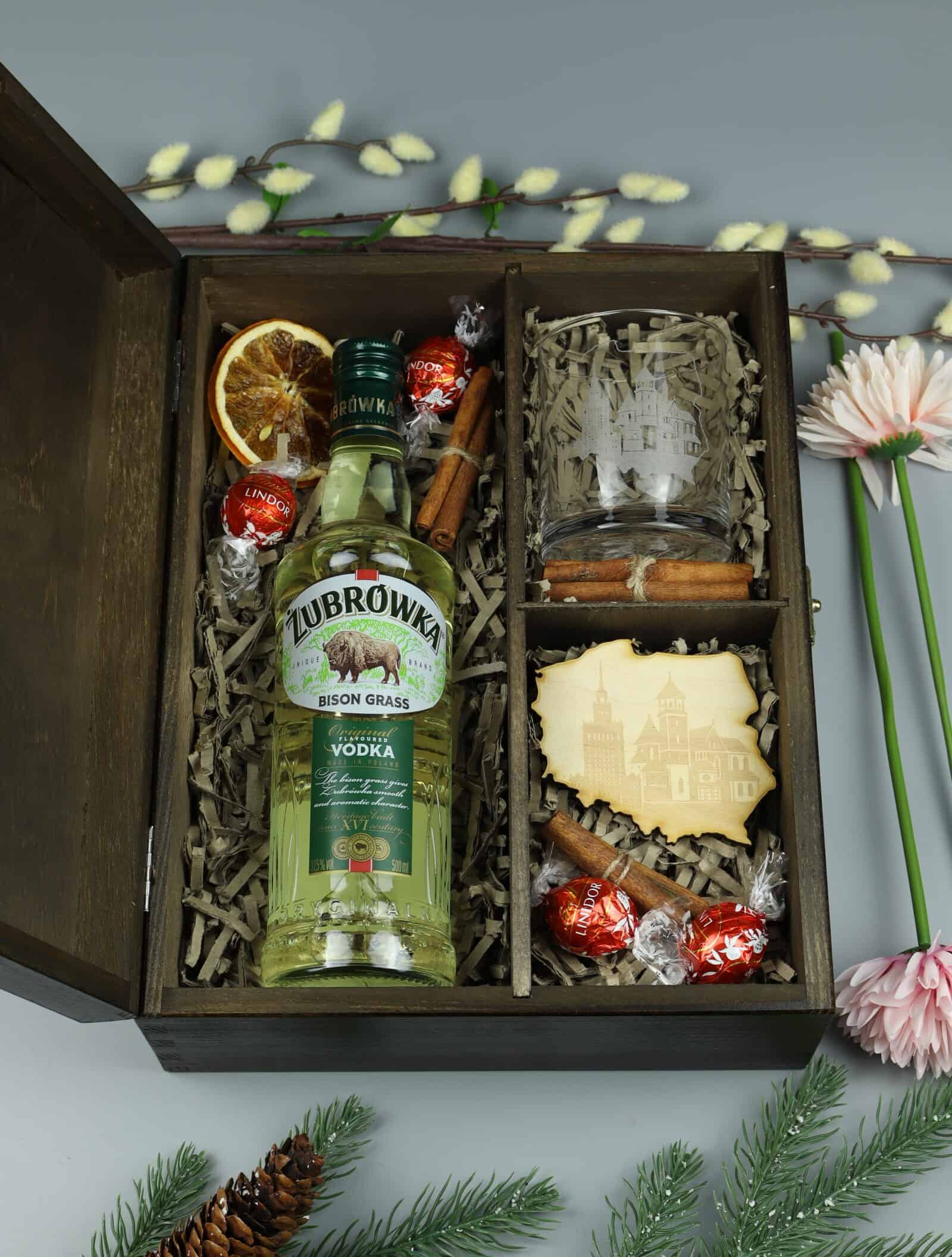 Zestaw „Pozdrowienia z Polski” – Żubrówka Bison Grass w eleganckiej skrzynce z grawerem