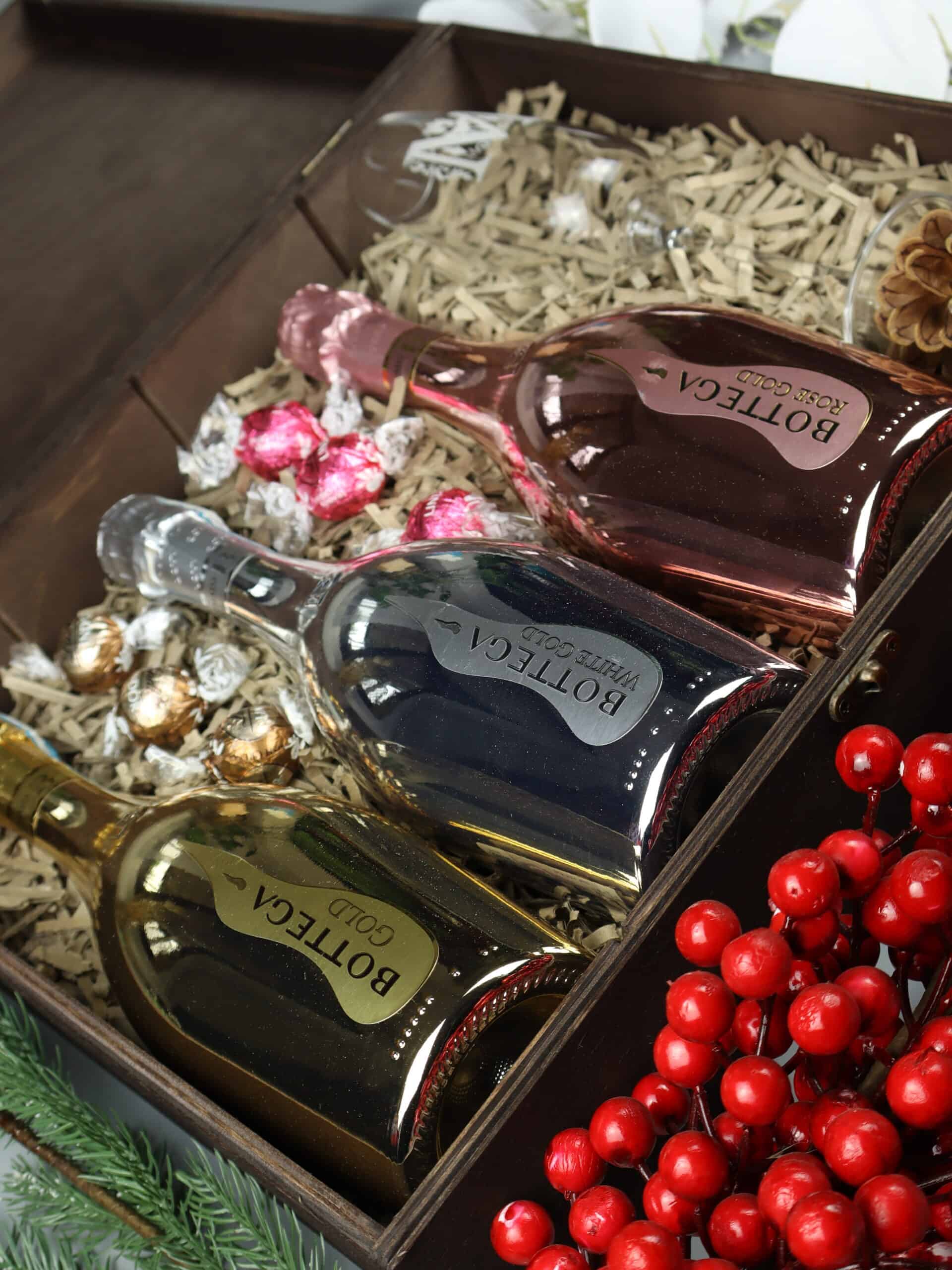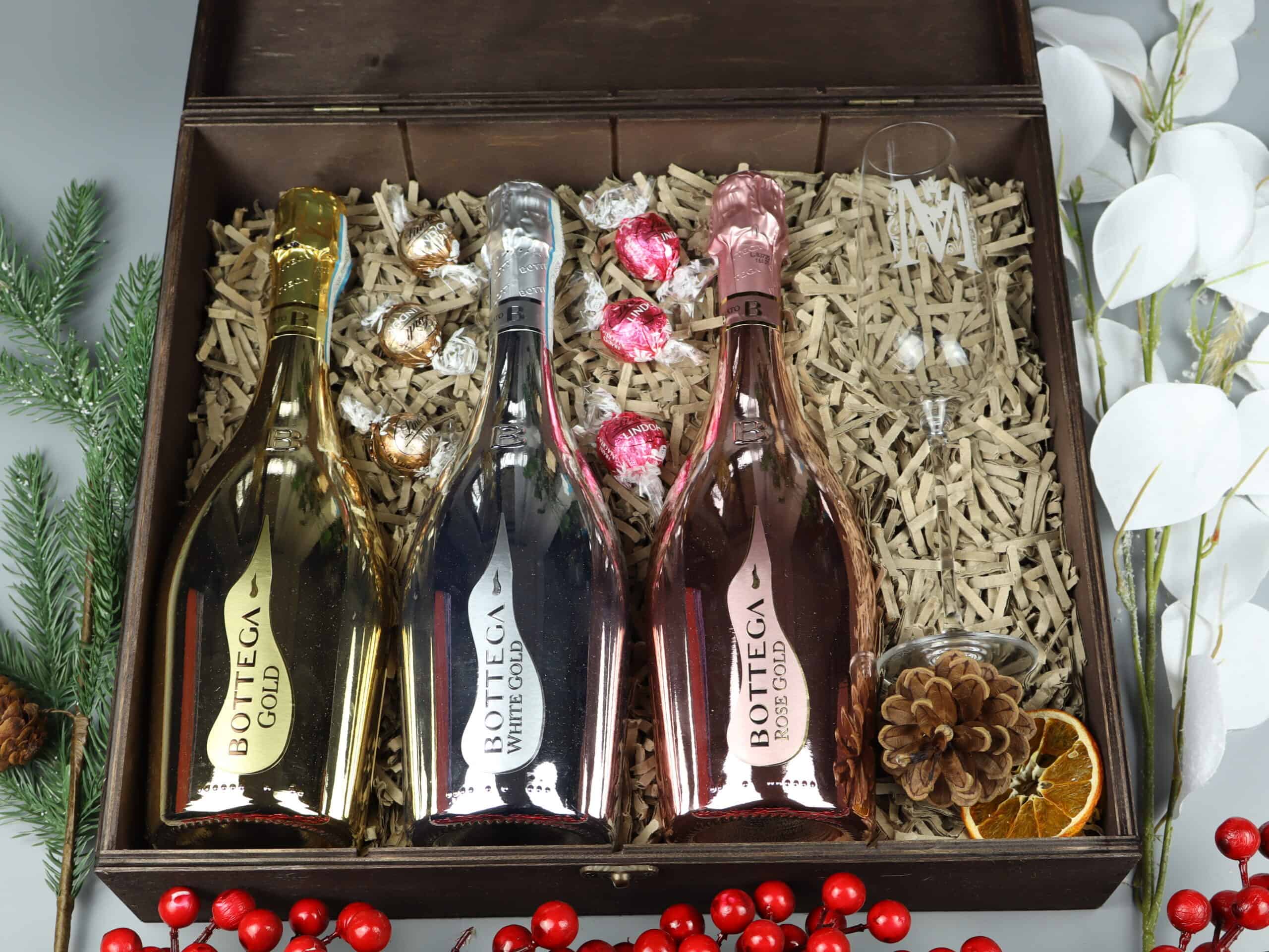 Ekskluzywny zestaw prezentowy Bottega – trzy wina musujące z kieliszkami i pralinami w ozdobnej skrzynce