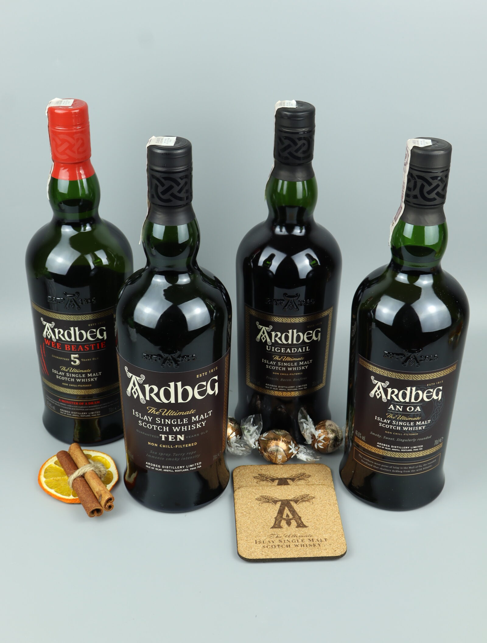 • Kolekcja Potworów z Islay: Zestaw czterech kultowych whisky Ardbeg (Wee Beastie, Ten, An Oa, Uigeadail) o potężnym, dymnym charakterze.
