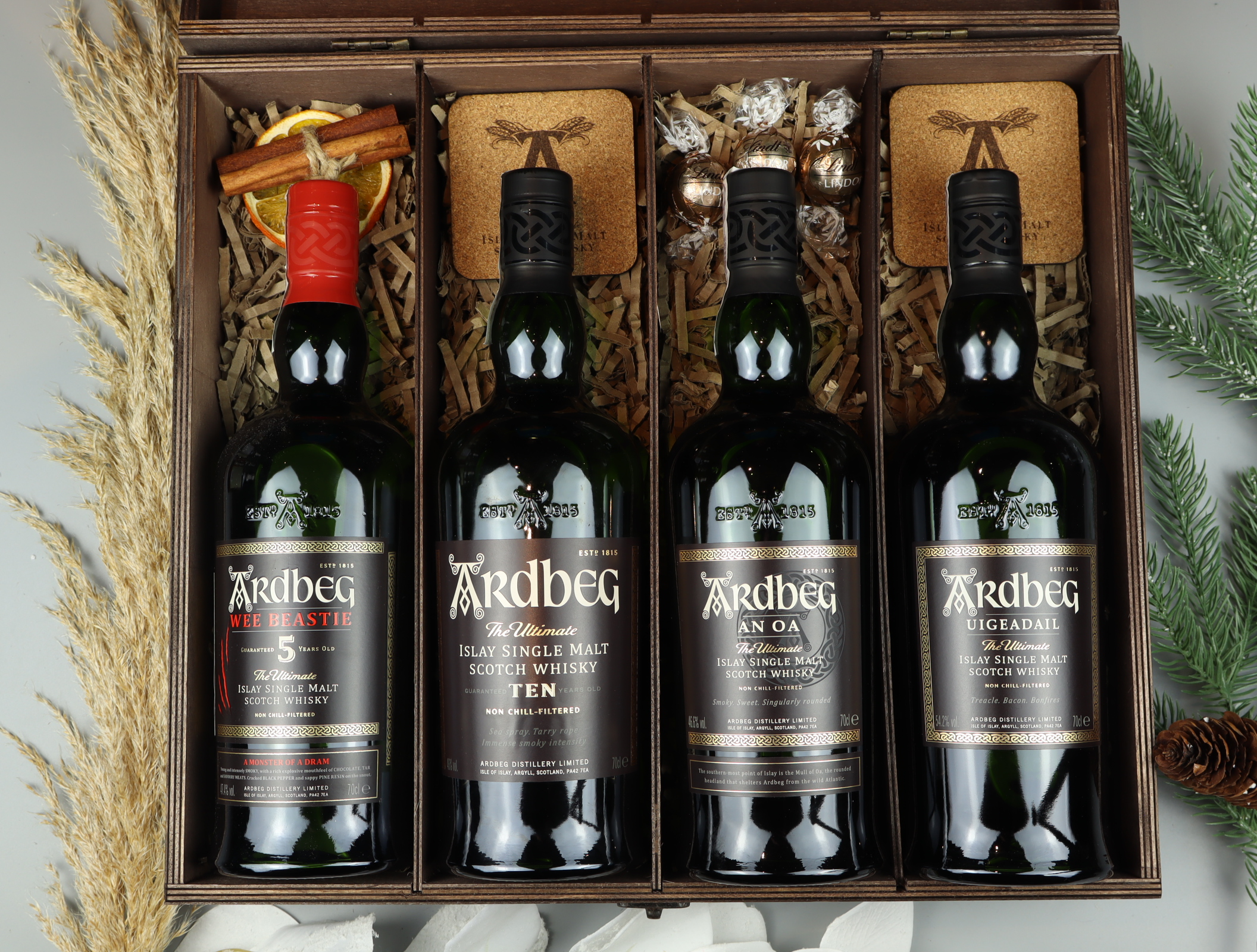Nasz zestaw Ardbeg to propozycja klasy premium dla koneserów torfowej szkockiej whisky i miłośników wyspy Islay. Starannie skomponowany zestaw czterech kultowych single maltów Ardbeg umieszczonych w eleganckiej, drewnianej skrzynce z przegrodami tworzy wyjątkowy, kolekcjonerski prezent – idealny na najważniejsze okazje.