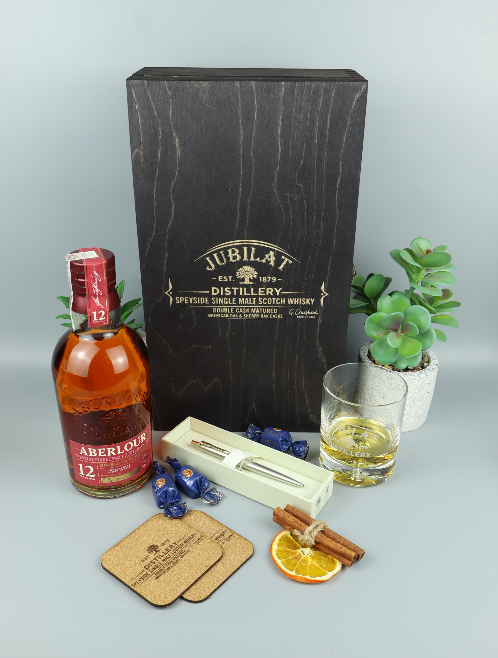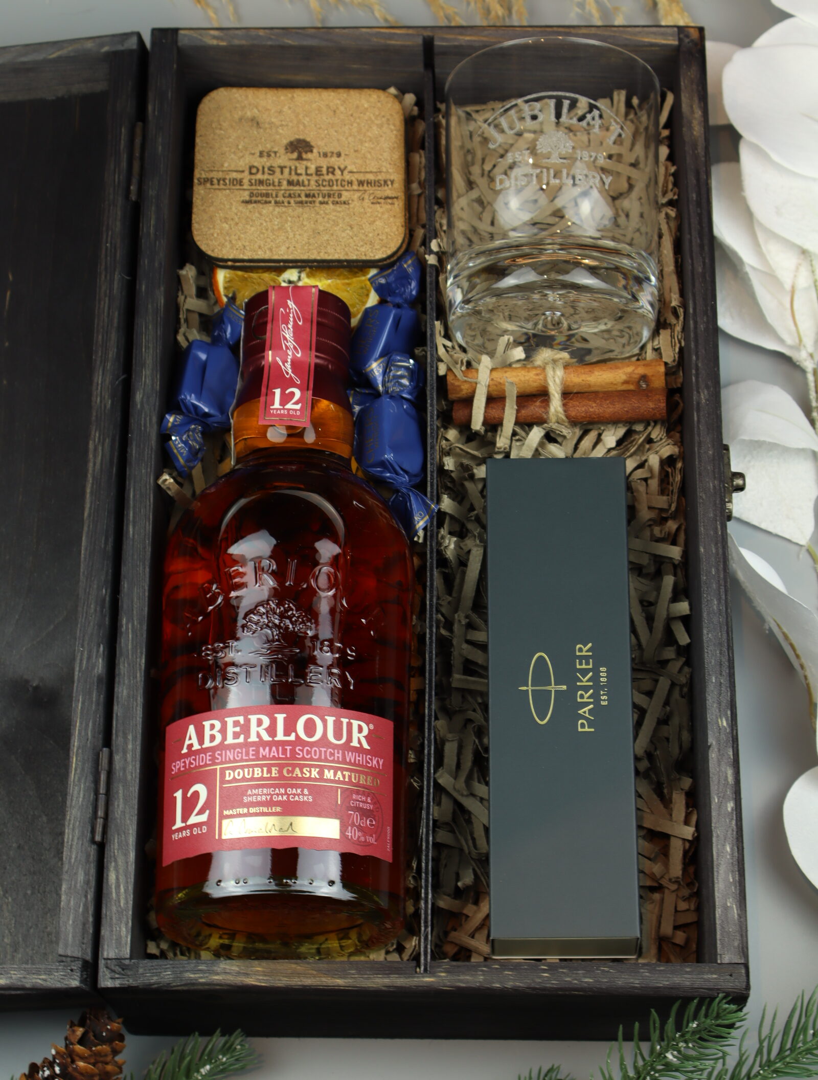 Zaskoczenie. Uśmiech. Błysk w oku. To właśnie zobaczysz, gdy wręczysz tę elegancką, grawerowaną skrzynię. Gdy wieko się uniesie, oczom jubilata ukaże się nie tylko doskonała, 12-letnia whisky Aberlour słynąca z owocowo-korzennych nut, ale kompletny, luksusowy rytuał.