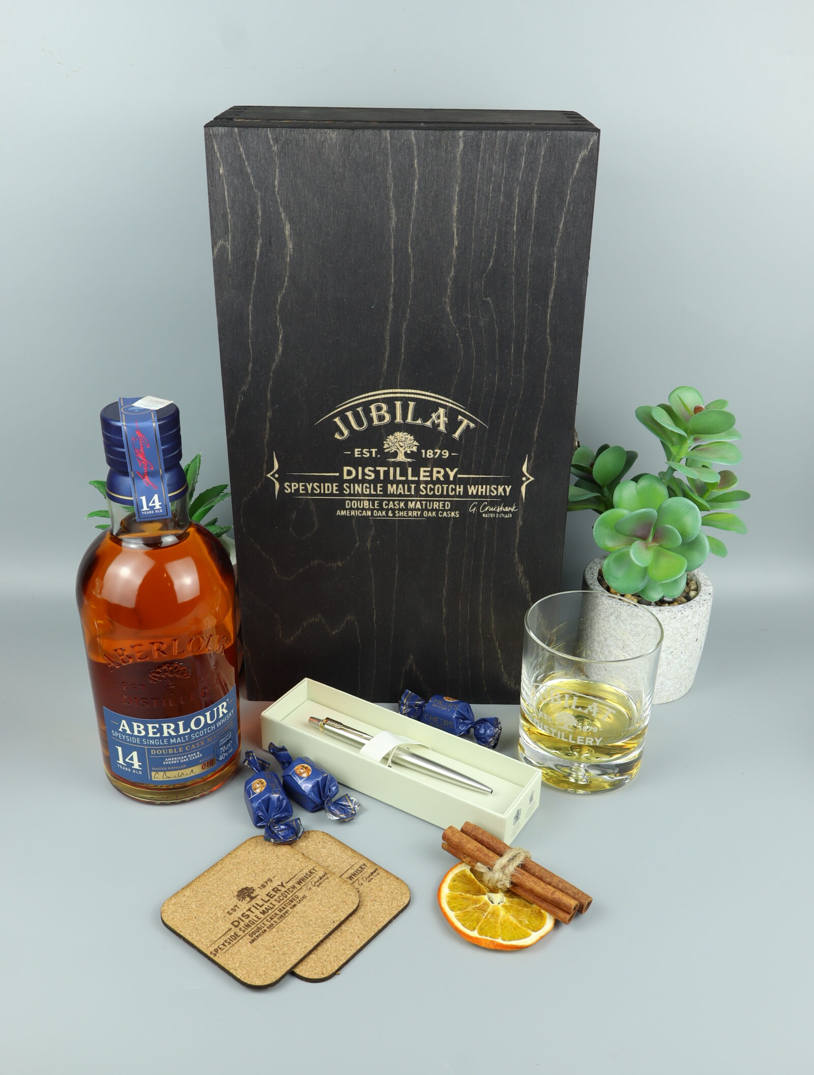 Nasz zestaw prezentowy z whisky Aberlour 14 YO to elegancka propozycja dla miłośników szkockiej whisky z regionu Speyside, słynącego z harmonijnych i bogatych w aromaty trunków. Aberlour 14 to whisky dojrzewająca w beczkach po bourbonie oraz sherry, dzięki czemu wyróżnia się głęboką barwą, aksamitną strukturą oraz nutami karmelu, wanilii i suszonych owoców. Całość została zapakowana w stylową drewnianą skrzynkę z grawerem, która podkreśla ekskluzywny charakter zestawu i sprawia, że jest on gotowy do wręczenia jako wyjątkowy prezent.