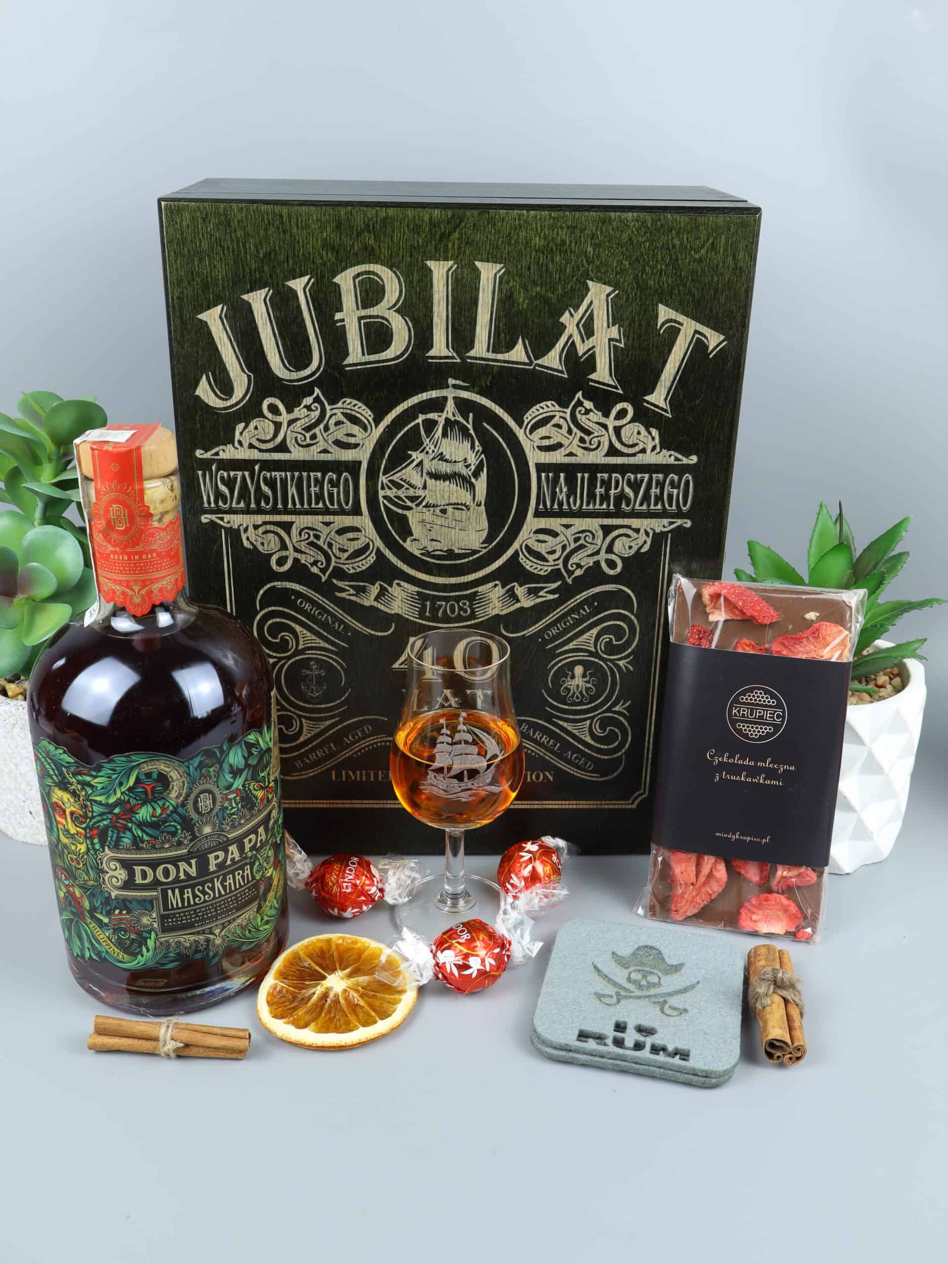 Podaruj wyjątkowy i elegancki prezent – zestaw z ekskluzywnym rumem Don Papa Masskara, kieliszkiem oraz drewnianą skrzynką z grawerem. Idealny dla miłośników luksusu, wyjątkowego smaku i unikatowych prezentów.