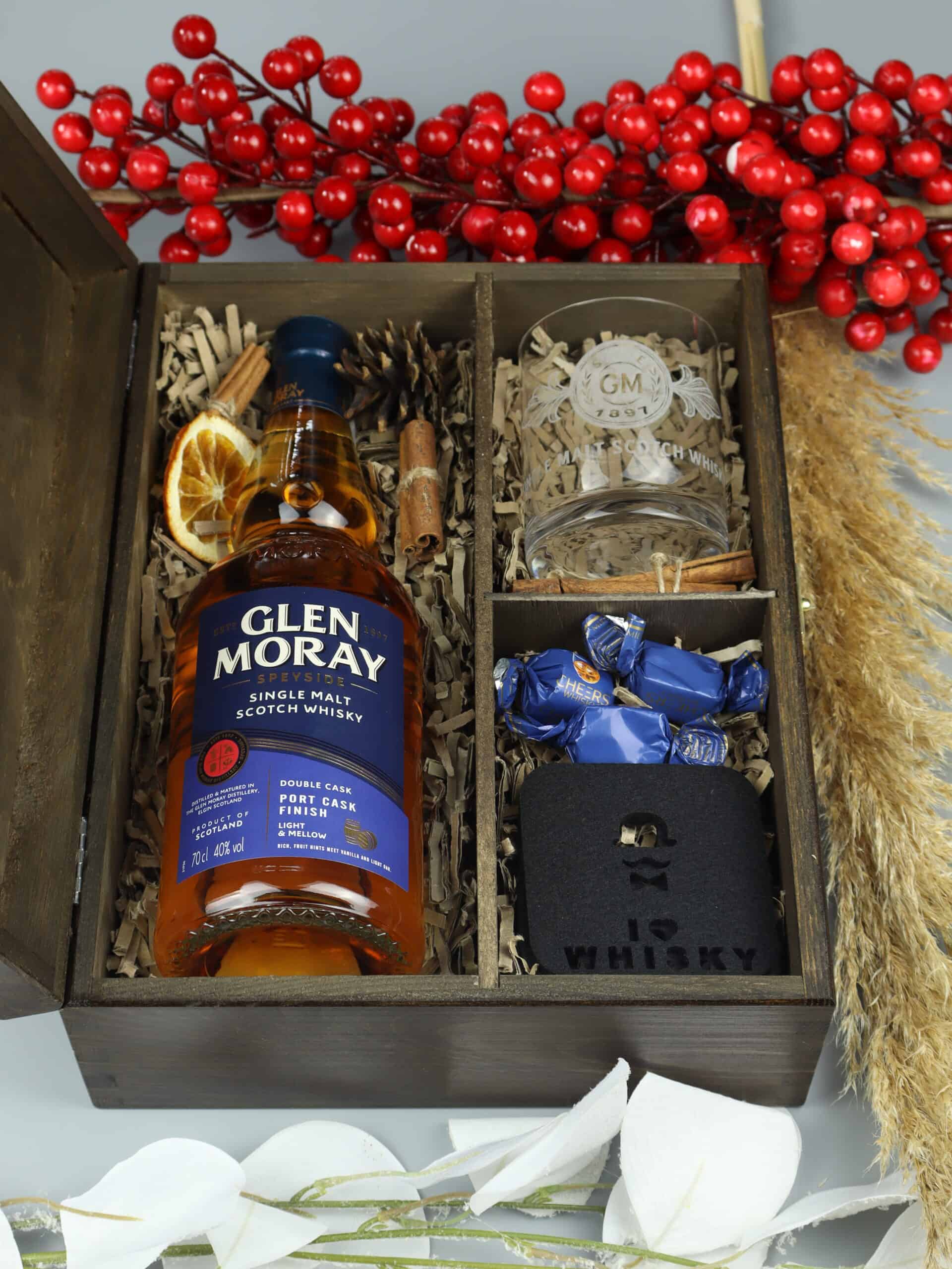Elegancki zestaw prezentowy, w którym główną rolę gra ceniona szkocka whisky Single Malt Glen Moray Port Cask Finish. W gustownej, drewnianej skrzyni z przegródkami znajduje się również markowa szklanka do degustacji