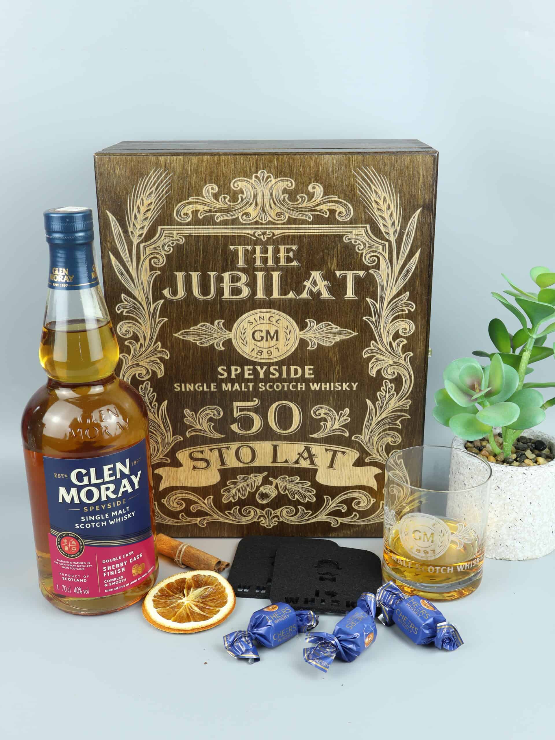 Elegancki zestaw prezentowy, stworzony specjalnie na 50. jubileusz. Zawiera butelkę szkockiej whisky Single Malt Glen Moray (Port Cask Finish), zamkniętą w imponującej, drewnianej skrzyni z precyzyjnym grawerem „JUBILAT STO LAT”