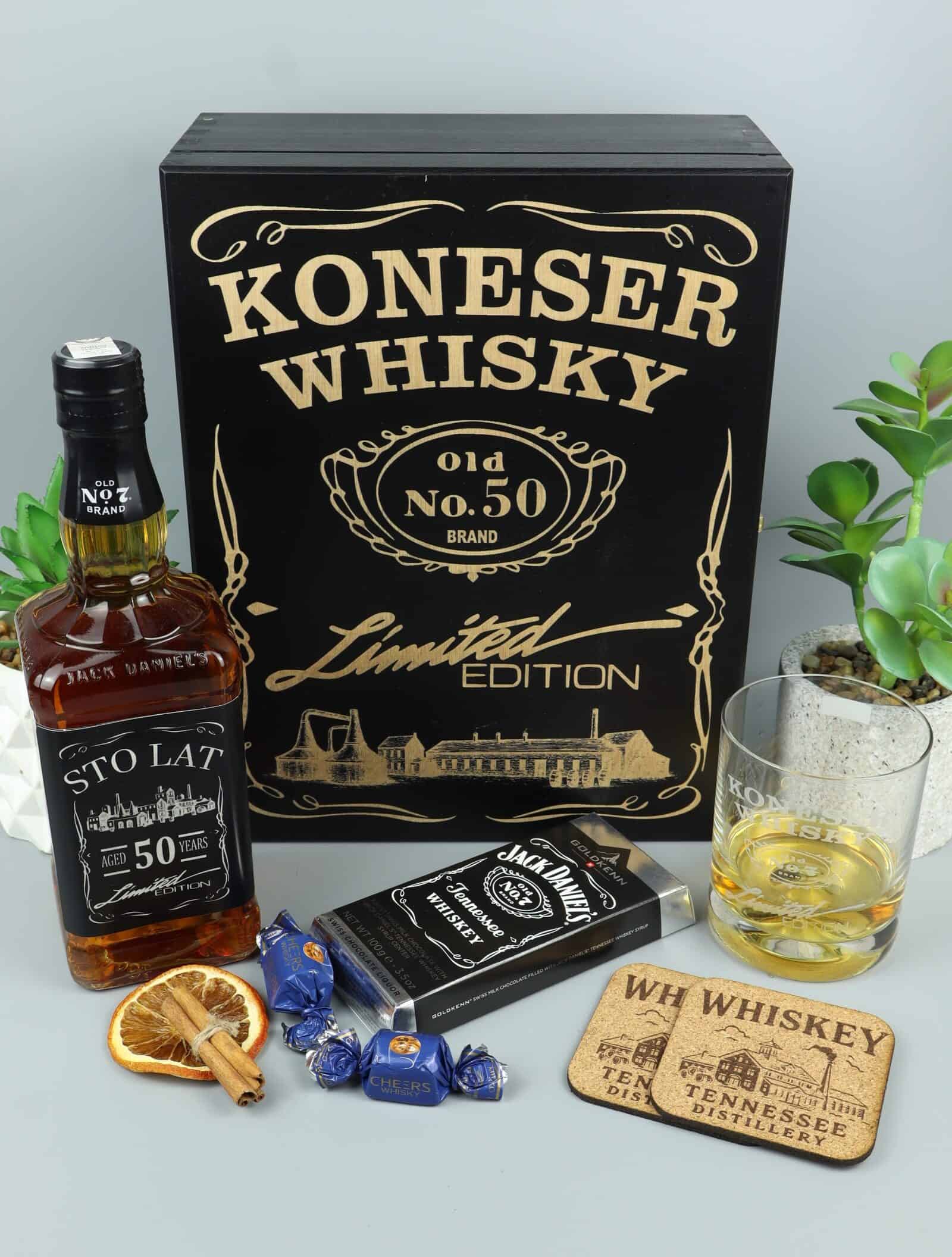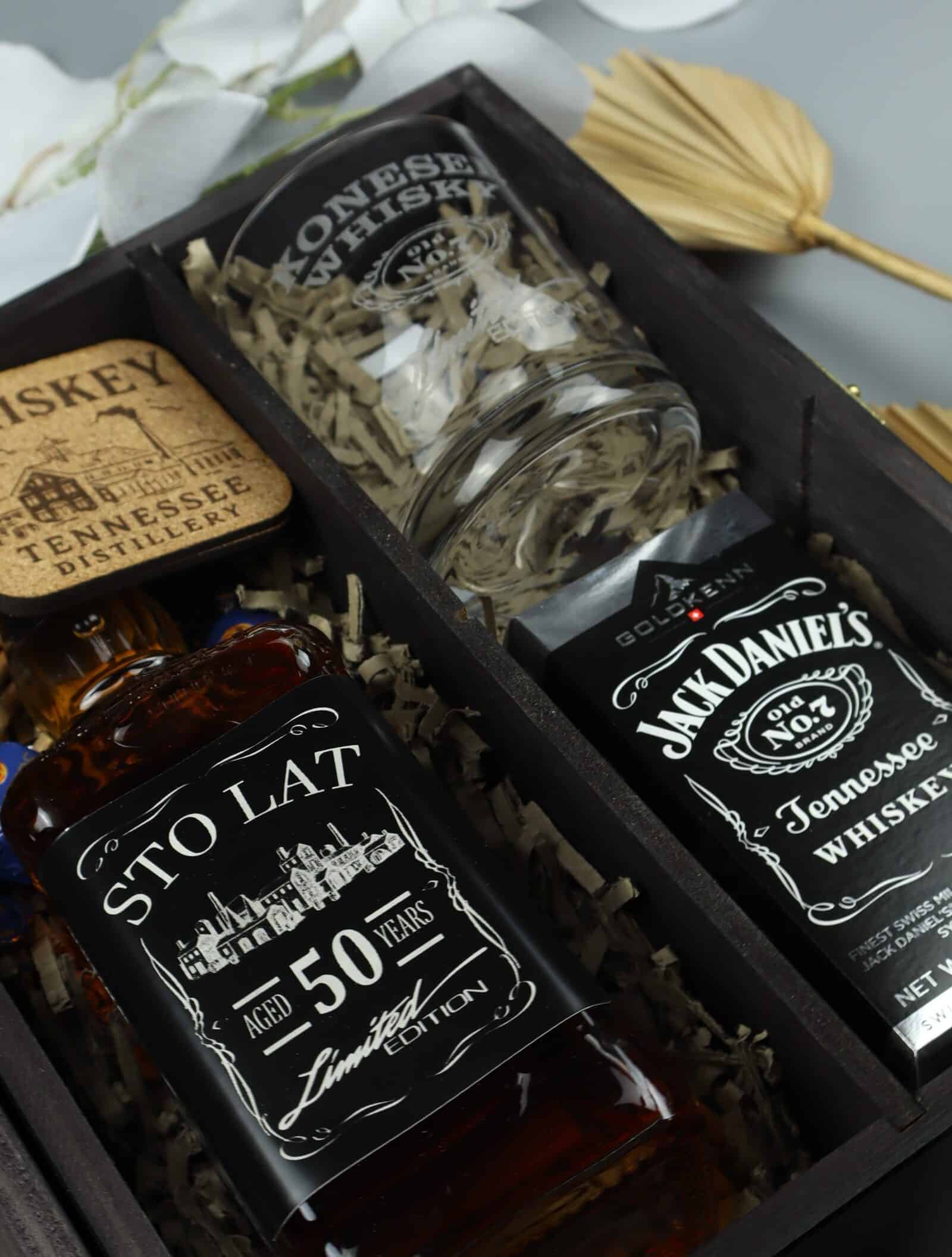 Luksusowy zestaw ’Koneser Whisky’ z butelką Jack Daniel’s (edycja 'Sto Lat’), grawerowaną szklanką i Czekoladą Jack Daniel’s