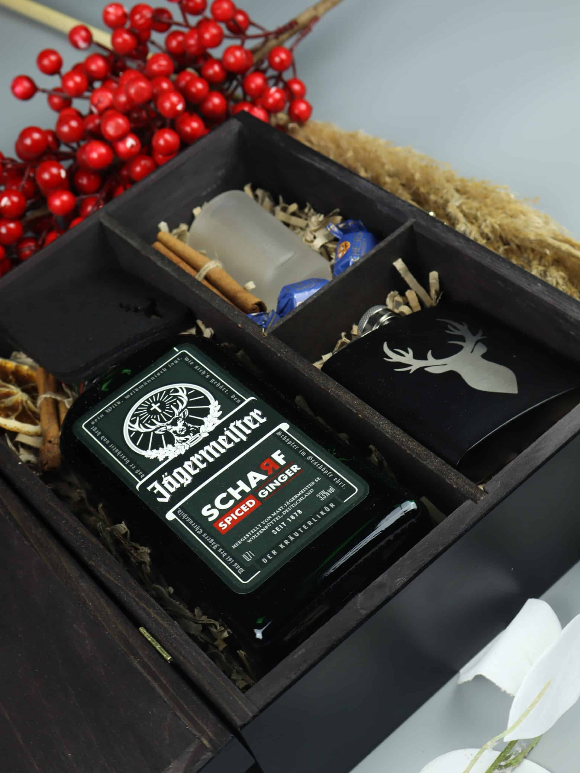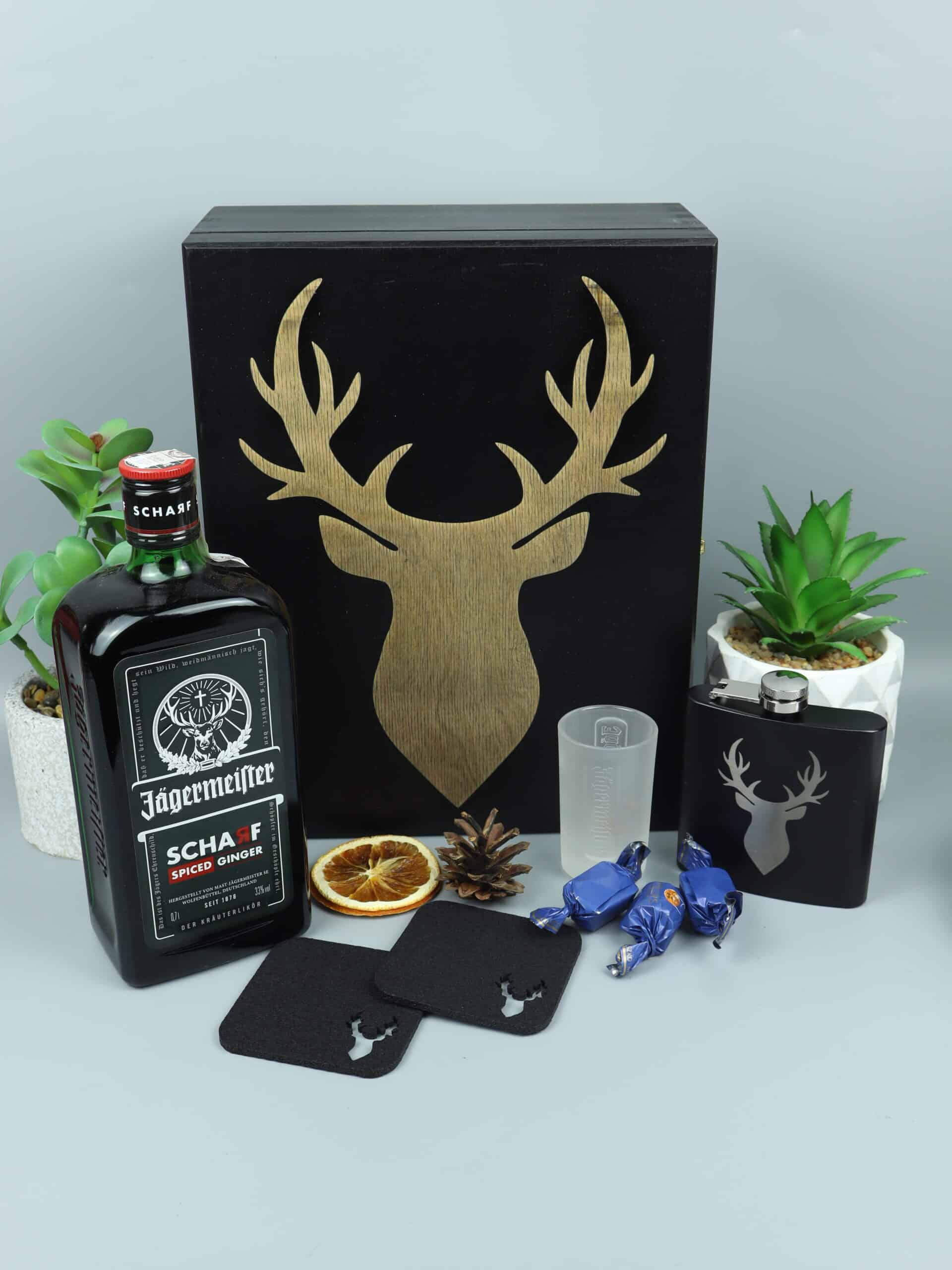 - Luksusowa Czarna Drewniana Skrzynka: Całość zapakowana jest w solidną, elegancką czarną skrzynkę, ozdobioną imponującym wizerunkiem jelenia – ikonicznego symbolu Jägermeister
