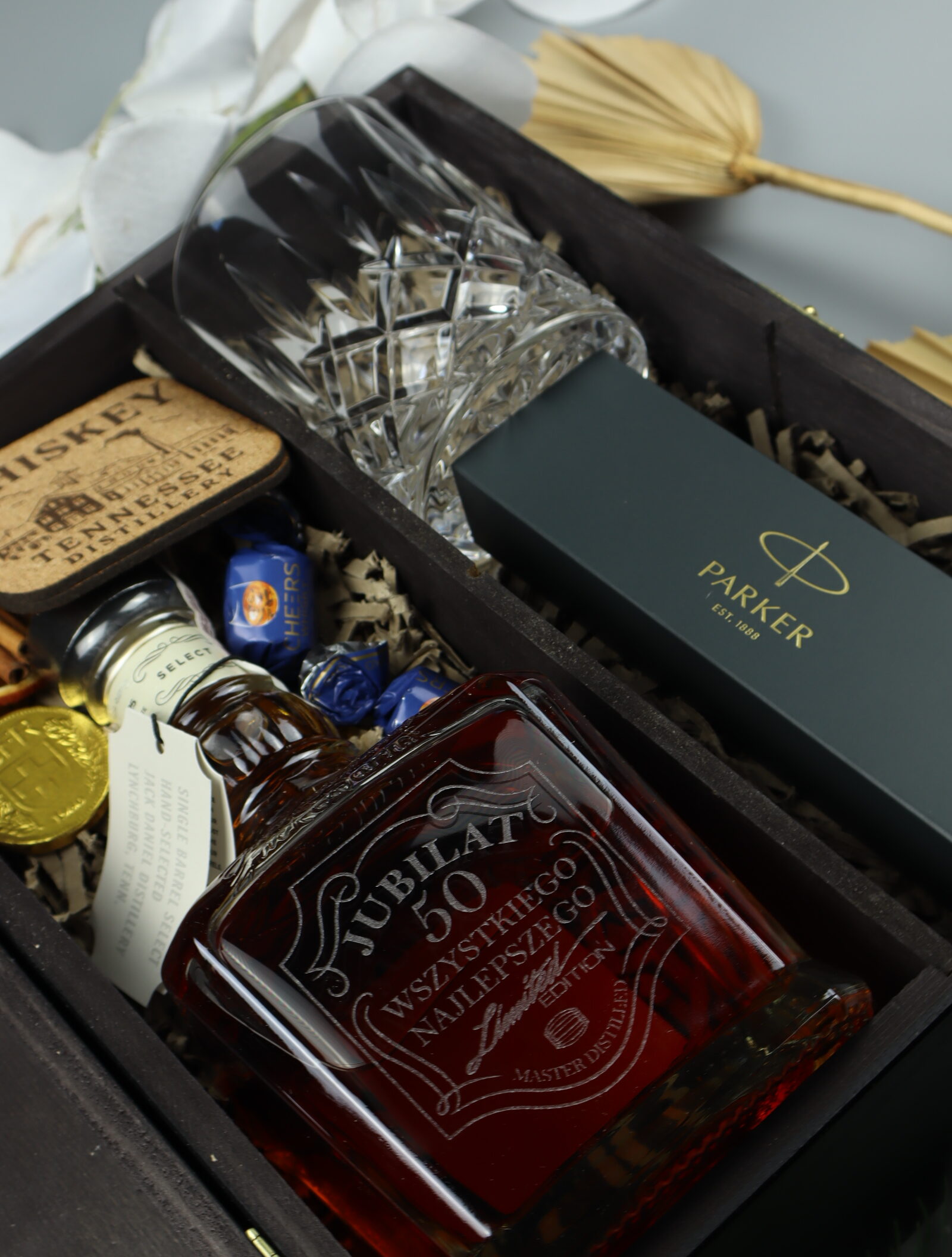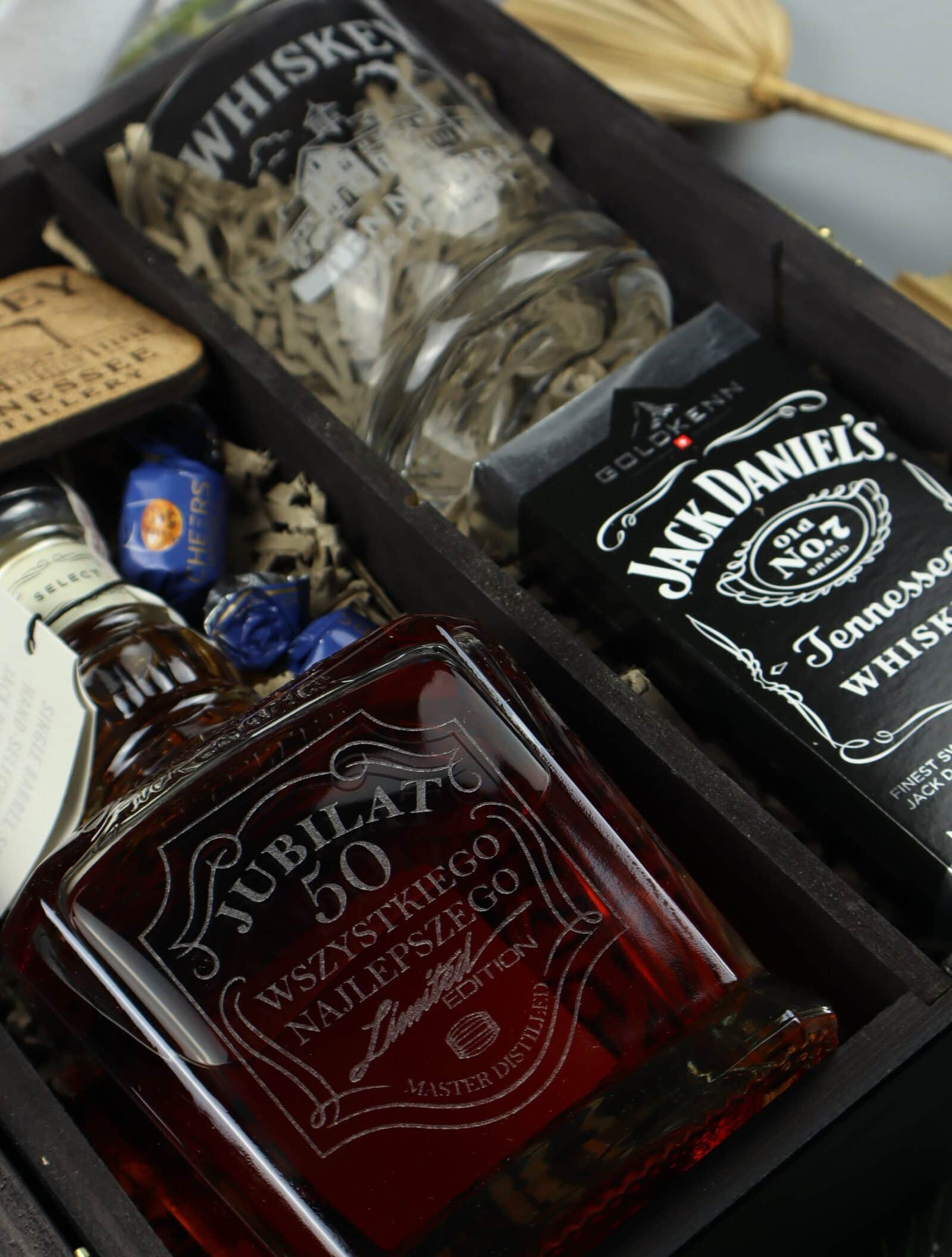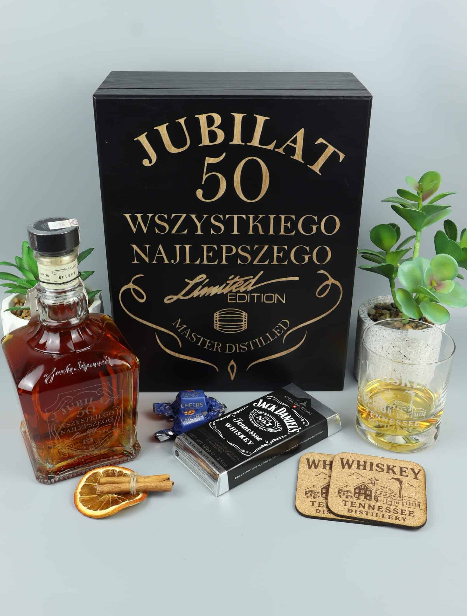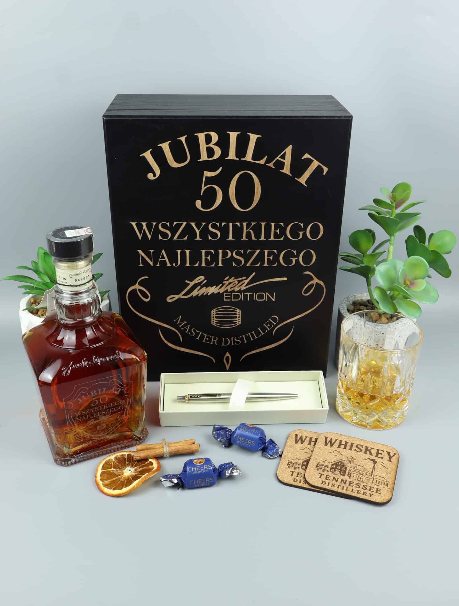 Ultra luksusowy zestaw na 50. urodziny z whisky Jack Daniel’s Single Barrel. Elegancka czarna skrzynka „Jubilat 50 – Wszystkiego Najlepszego”, butelka z grawerem na szkle oraz ekskluzywny długopis Parker.