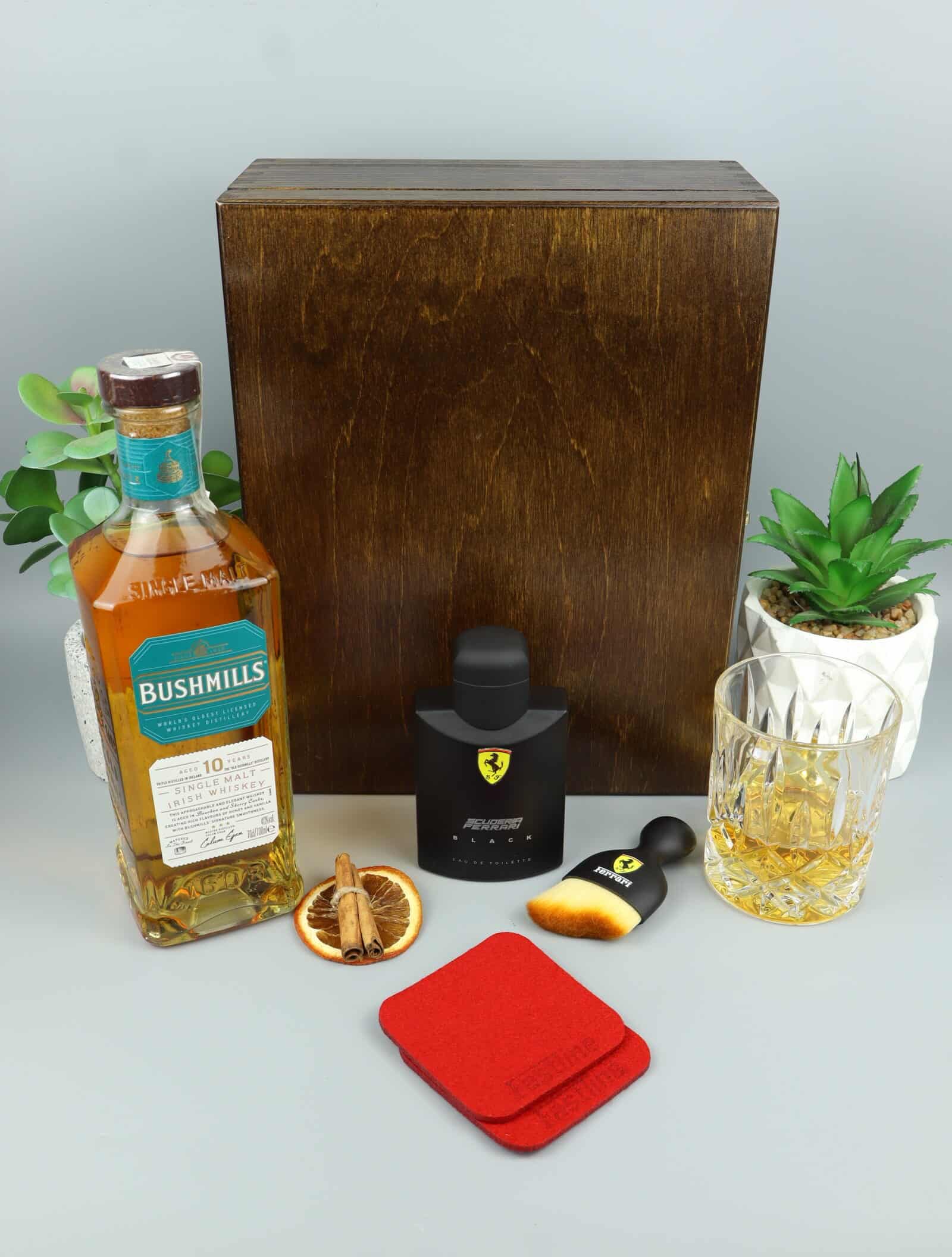 Luksusowy zestaw z whisky Bushmills 10-letnią Single Malt. Elegancka drewniana skrzynka, woda toaletowa Ferrari Black oraz akcesoria (pędzelek, podkładki) z logo Ferrari. Idealny, prestiżowy upominek dla konesera i fana włoskiej motoryzacji.