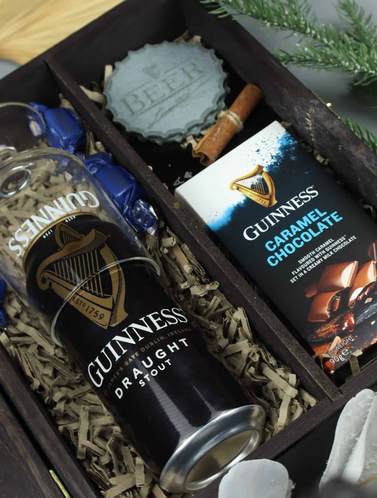 Szukasz gustownego prezentu dla fana Guinnessa? Nasz zestaw prezentowy Guinness to połączenie klasy, smaku i stylu, które idealnie sprawdzi się jako upominek dla każdego miłośnika piwa. Całość zapakowana w drewnianą skrzynkę z grawerem, tworzy wyjątkowy prezent gotowy do wręczenia.